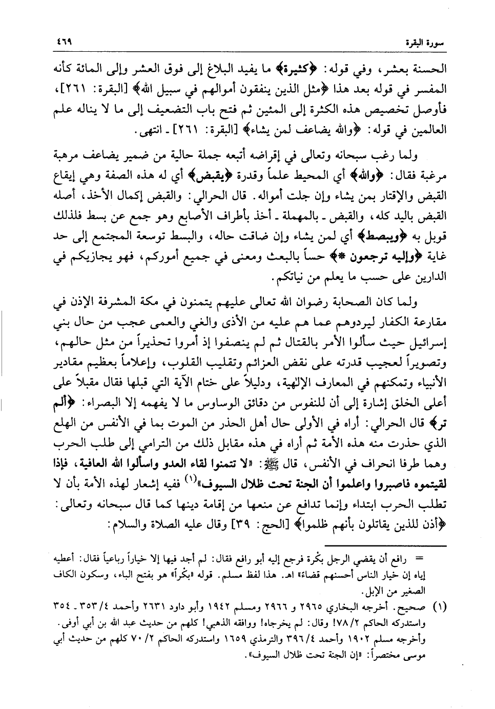 ولما كان الصحابة رضوان الله تعالى عليهم يتمنون في مكة المشرفة الإذن في مقارعة الكفار ليردوهم عما هم عليه من الأذى والغي والعمى عجب من حال بني إسرائيل حيث سألوا الأمر بالقتال ثم لم ينصفوا إذ أمروا تحذيراً من مثل حالهم ، وتصويراً لعجيب قدرته على نقض العزائم وتقليب القلوب ، وإعلاماً بعظيم مقادير الأنبياء وتمكنهم في المعارف الإلهية ، ودليلاً على ختام الآية التي قبلها فقال مقبلاً على أعلى الخلق إشارة إلى أن للنفوس من دقائق الوساوس ما لا يفهمه إلا البصراء : ( ألم تر ( قال الحرالي : أراه في الأولى حال أهل الحذر من الموت بما في الأنفس من الهلع الذي حذرت منه هذه الأمة ثم أراه في هذه مقابل ذلك من الترامي إلى طلب الحرب وهما طرفا انحراف في الأنفس ، قال ( صلى الله عليه وسلم ) : ( لا تتمنوا لقاء العدو واسألوا الله العافية ، فإذا لقيتموه فاصبروا واعلموا أن الجنة تحت ظلال السيوف ) ففيه إشعار لهذه الأمة بأن لا تطلب الحرب ابتداء وإنما تدافع عن منعها من إقامة دينها كما قال سبحانه وتعالى :