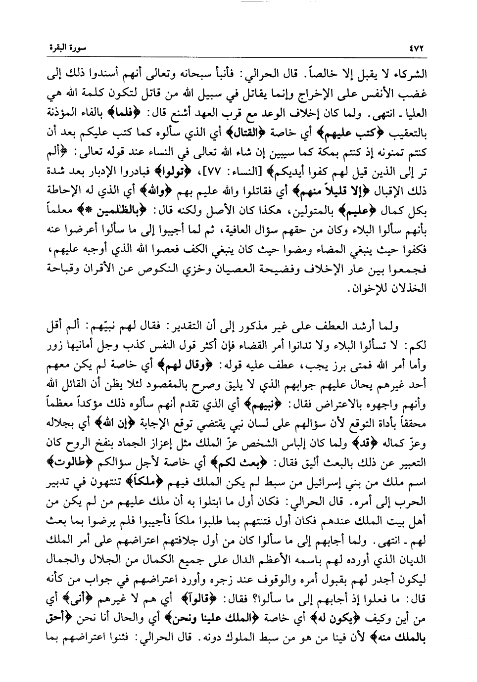 ولما أرشد العطف على غير مذكور إلى أن التقدير : فقال لهم نبيّهم : ألم أقل لكم : لا تسألوا البلاء ولا تدانوا أمر القضاء فإن أكثر قول النفس كذب وجل أمانيها زور وأما أمر الله فمتى برز يجب ، عطف عليه قوله : ( وقال لهم ) أي خاصة لم يكن معهم أحد غيرهم يحال عليهم جوابهم الذي لا يليق وصرح بالمقصود لئلا يظن أن القائل الله وأنهم واجهوه بالاعتراض فقال : ( نبيهم ) أي الذي تقدم أنهم سالوه ذلك مؤكداً معظماً محققاً بأداة التوقع لأن سؤالهم على لسان نبي يقتضي توقع الإجابة ) إن الله ) أي بجلاله وعزّ كماله ) قد ( ولما كان إلباس الشخص عزّ الملك مثل إعزاز الجماد بنفخ الروح كان التعبير عن ذلك بالبعث أليق فقال : ( بعث لكم ) أي خاصة لأجل سؤالكم ) طالوت ( اسم ملك من بني إسرائيل من سبط لم يكن الملك فيهم ) ملكاً ( تنتهون في تدبير الحرب إلى أمره .