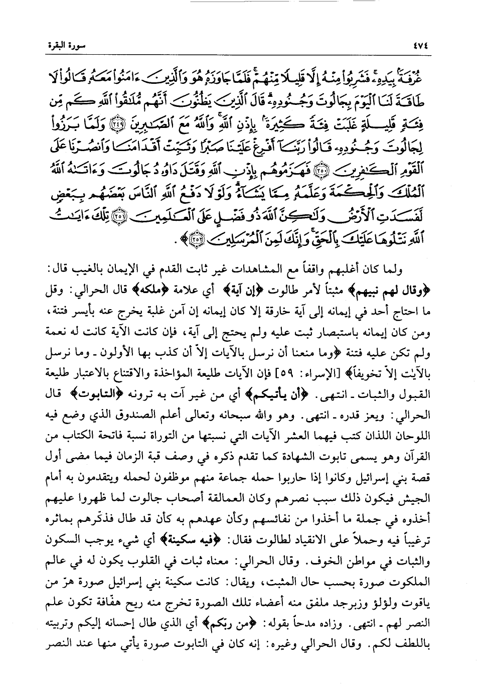 غُرْفَةً بِيَدِهِ فَشَرِبُواْ مِنْهُ إِلاَّ قَلِيلاً مِّنْهُمْ فَلَمَّا جَاوَزَهُ هُوَ وَالَّذِينَ آمَنُواْ مَعَهُ قَالُواْ لاَ طَاقَةَ لَنَا الْيَوْمَ بِجَالُوتَ وَجُنودِهِ قَالَ الَّذِينَ يَظُنُّونَ أَنَّهُمْ مُلاَقُواْ اللَّهِ كَم مِّن فِئَةٍ قَلِيلَةٍ غَلَبَتْ فِئَةٍ كَثِيرَةً بِإِذْنِ اللَّهِ وَاللَّهُ مَعَ الصَّابِرِينَ وَلَمَّا بَرَزُواْ لِجَالُوتَ وَجُنُودِهِ قَالُواْ رَبَّنَآ أَفْرِغْ عَلَيْنَا صَبْراً وَثَبِّتْ أَقْدَامَنَا وَانْصُرْنَا عَلَى الْقَوْمِ الْكَافِرِينَ فَهَزَمُوهُمْ بِإِذْنِ اللَّهِ وَقَتَلَ دَاوُدُ جَالُوتَ وَآتَاهُ اللَّهُ الْمُلْكَ وَالْحِكْمَةَ وَعَلَّمَهُ مِمَّا يَشَآءُ وَلَوْلاَ دَفْعُ اللَّهِ النَّاسَ بَعْضَهُمْ بِبَعْضٍ لَفَسَدَتِ الأَرْضُ وَلَكِنَّ اللَّهَ ذُو فَضْلٍ عَلَى الْعَالَمِينَ تِلْكَ آيَاتُ اللَّهِ نَتْلُوهَا عَلَيْكَ بِالْحَقِّ وَإِنَّكَ لَمِنَ الْمُرْسَلِينَ ) 73