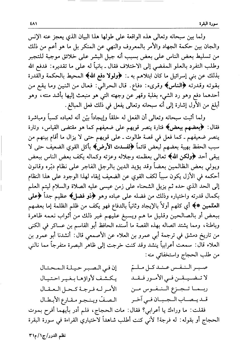 ولما أثبت سبحانه وتعالى أن الفعل له خلقاً وإيجاداً بيّن أنه لعباده كسباً ومباشرة فقال : ( بعضهم ببعض ( فتارة ينصر قويهم على ضعيفهم كما هو مقتضى القياس ، وتارة ينصر ضعيفهم - كما فعل في قصة طالوت - على قويهم حتى لا يزال ما أقام بينهم من سبب الحفظ بهيبة بعضهم لبعض قائماً ) لفسدت الأرض ( بأكل القوي الضعيف حتى لا يبقى أحد ) ولكن الله ( تعالى بعظمته وجلاله وعزته وكماله يكف بعض الناس ببعض ويولي بعض الظالمين بعضاً وقد يؤيد الدين بالرجل الفاجر على نظام دبّره وقانون أحكمه في الأزل يكون سبباً لكف القوي عن الضعيف إبقاء لهذا الوجود على هذا النظام إلى الحد الذي حده ثم يزيل الشحناء على زمن عيسى عليه الصلاة والسلام ليتم العلم بكمال قدرته واختياره وذلك من فضله على عباده وهو ) ذو فضل ( عظيم جداً ) على العالمين ) أي كلهم أولاً بالإيجاد وثانياً بالدفاع فهو يكف من ظلم الظلمة إما بعضهم ببعض أو بالصالحين وقليل ما هم ويسبغ عليهم غير ذلك من أثواب نعمه ظاهرة وباطنة ، ومما يشتد اتصاله بهذه القصة ما أسنده الحافظ أبو القاسم بن عساكر في الكنى من تاريخ دمشق في ترجمة أبي عمرو بن العلاء عن الأصمعي قال : أنشدنا أبو عمرو بن العلاء قال : سمعت أعرابياً ينشد وقد كنت خرجت إلى ظاهر البصرة متفرجاً مما نالني من طلب الحجاج واستخفائي منه :