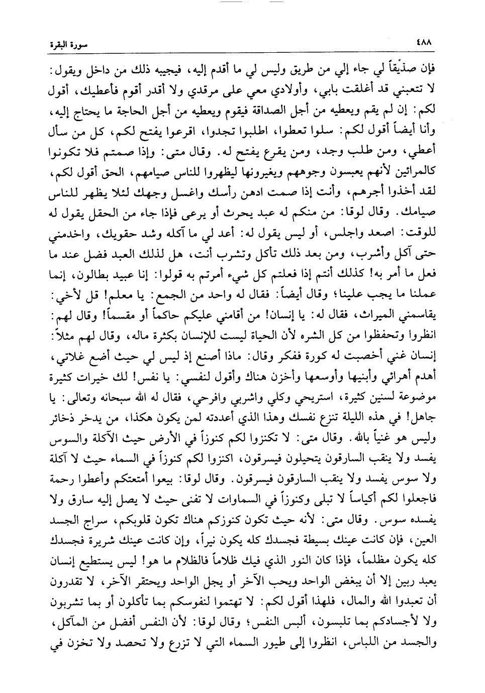 وقال لوقا : من منكم له عبد يحرث أو يرعى فإذا جاء من الحقل يقوله له للوقت : اصعد واجلس ، أو ليس يقول له : أعد لي ما آكله وشد حقويك ، واخدمني حتى آكل وأشرب ، ومن بعد ذلك تأكل وتشرب أنت ، هل لذلك العبد فضل عند ما فعل ما أمر به كذلك أنتم إذا فعلتم كل شيء أمرتم به قولوا : إنا عبيد بطالون ، إنما عملنا ما يجب علينا ؛ وقال أيضاً : فقال له واحد من الجمع : يا معلم قل لأخي : يقاسمني الميراث ، فقال له : يا إنسان منن أقامني عليكم حاكماً أو مقسماً وقال لهم : انظروا وتحفظوا من كل الشره لأن الحياة ليست للإنسان بكثرة ماله ، وقال لهم مثلاً : إنسان غني أخصبت له كورة ففكر وقال : ماذا أصنع إذ ليس لي حيث أضع غلاتي ، أهدم أهرائي وأبنيها وأوسعها وأخزن هناك وأقول لنفسي : يا نفس لك خيرات كثيرة موضوعة لسنين كثيرة ، استريحي وكلي واشربي وافرحي ، فقال له الله سبحانه وتعالى : يا جاهل في هذه الليلة تنزع نفسك وهذا الذي أعددته لمن يكون هكذا ، من يدخر ذخائر وليس هو غنياً بالله .