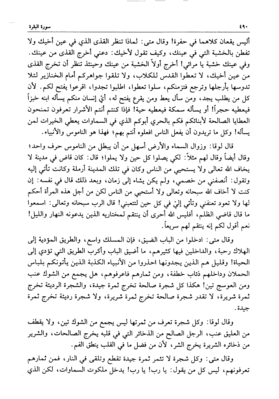وقال متى : ادخلوا من الباب الضيق ، فإن المسلك واسع ، والطريق المؤدية إلى الهلاك رحبة ، والداخلين فيها كثيرهم ، ما أضيق الباب وأكرب الطريق التي تؤدي إلى الحياة وقليل هم الذين يجدونها احذروا من الأنبياء الكذبة الذين يأتونكم بلباس الحملان وداخلهم ذئاب خطفة ، ومن ثمارهم فاعرفوهم ، هل يجمع من الشوك عنب ومن العوسج تين هكذا كل شجرة صالحة تخرج ثمرة جيدة ، والشجرة الرديئة تخرج ثمرة شريرة ، لا تقدر شجرة صالحة تخرج ثمرة شريرة ، ولا شجرة رديئة تخرج ثمرة جيدة .