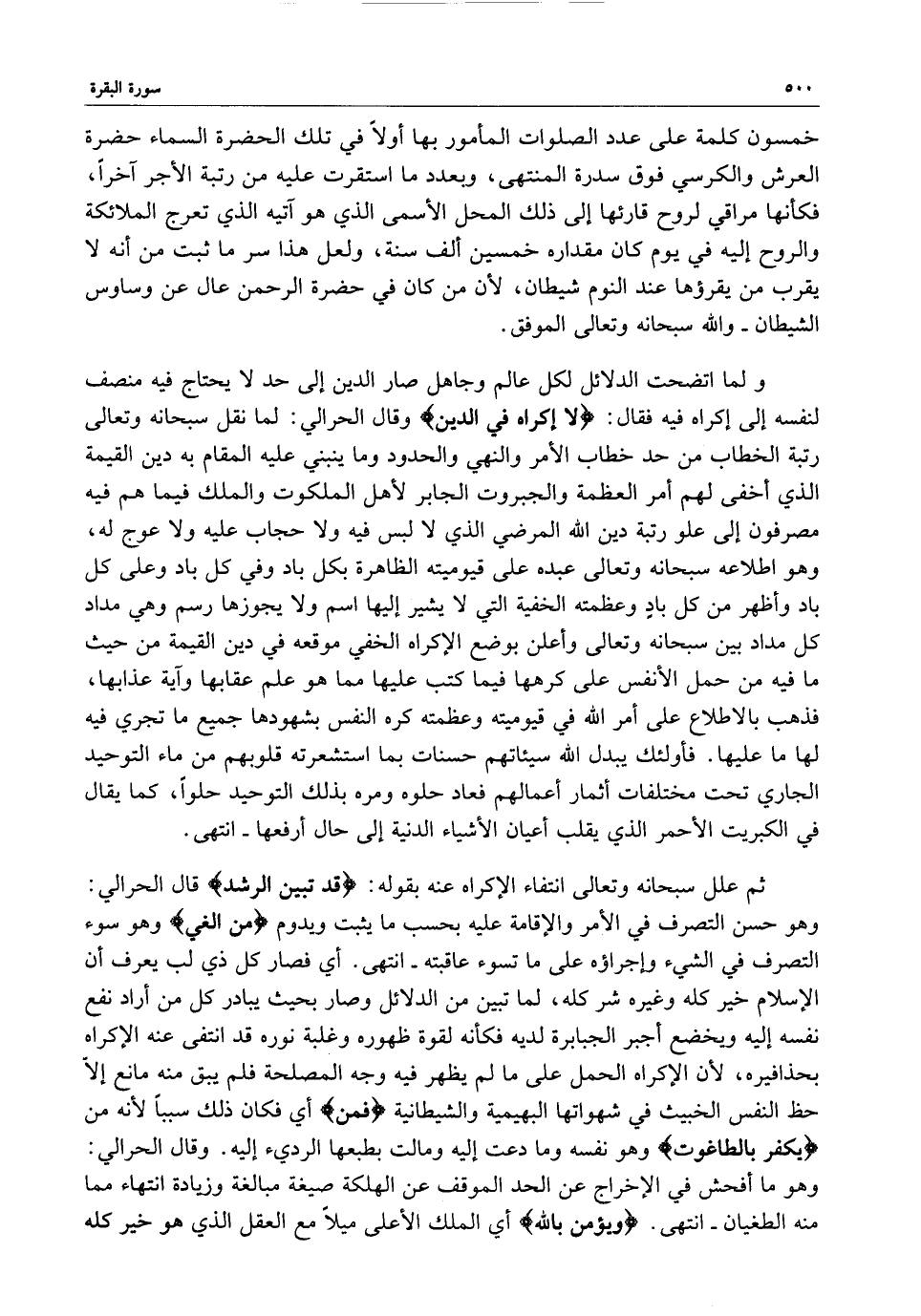 ولما اتضحت الدلائل لكل عالم وجاهل صار الدين إلى حد لا يحتاج فيه منصف لنفسه إلى إكراه فيه فقال : ( لا إكراه في الدين ( وقال الحرالي : لما نقل سبحانه وتعالى رتبة الخطاب من حد خطاب الأمر والنهي والحدود وما ينبني عليه المقام به دين القيمة الذي أخفى لهم أمر العظمة والجبروت الجابر لأهل الملكوت والملك فيما هم فيه مصرفون إلى علو رتبة دين الله المرضي الذي لا لبس فيه ولا حجاب عليه ولا عوج له ، وهو اطلاعه سبحانه وتعالى عبده على قيوميته الظاهرة بكل باد وفي كل باد وعلى كل باد وأظهر من كل بادٍ وعظمته الخفية التي لا يشير إليها اسم ولا يجوزها رسم وهي مداد كل مداد بين سبحانه وتعالى وأعلن بوضع الإكراه المفي موقعه في دين القيمة من حيث ما فيه من حمل الأنفس على كرهها فيما كتب عليها مما هو علم عقابها وآية عذابها ، فذهب بالاطلاع على أمر الله في قيوميته وعظمته كره النفس بشهودها جميع ما تجري فيه لها ما عليها .