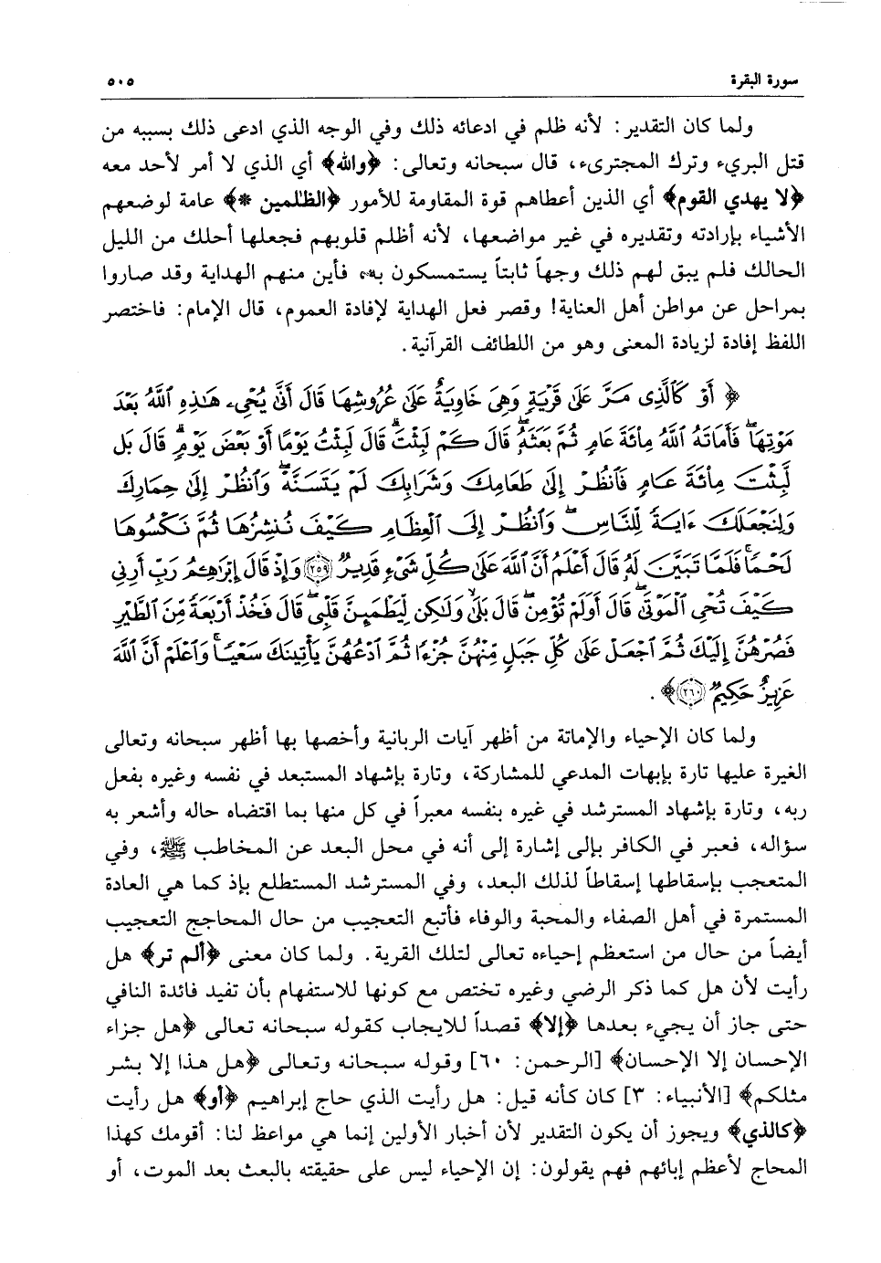 ) أَوْ كَالَّذِي مَرَّ عَلَى قَرْيَةٍ وَهِيَ خَاوِيَةٌ عَلَى عُرُوشِهَا قَالَ أَنَّى يُحْيِي هَذِهِ اللَّهُ بَعْدَ مَوْتِهَا فَأَمَاتَهُ اللَّهُ مِئَةَ عَامٍ ثُمَّ بَعَثَهُ قَالَ كَمْ لَبِثْتَ قَالَ لَبِثْتُ يَوْماً أَوْ بَعْضَ يَوْمٍ قَالَ بَل لَّبِثْتَ مِئَةَ عَامٍ فَانْظُرْ إِلَى طَعَامِكَ وَشَرَابِكَ لَمْ يَتَسَنَّهْ وَانْظُرْ إِلَى حِمَارِكَ وَلِنَجْعَلَكَ آيَةً لِلنَّاسِ وَانْظُرْ إِلَى العِظَامِ كَيْفَ نُنْشِزُهَا ثُمَّ نَكْسُوهَا لَحْماً فَلَمَّا تَبَيَّنَ لَهُ قَالَ أَعْلَمُ أَنَّ اللَّهَ عَلَى كُلِّ شَيْءٍ قَدِيرٌ وَإِذْ قَالَ إِبْرَاهِيمُ رَبِّ أَرِنِي كَيْفَ تُحْيِي الْمَوْتَى قَالَ أَوَلَمْ تُؤْمِن قَالَ بَلَى وَلَكِن لِّيَطْمَئِنَّ قَلْبِي قَالَ فَخُذْ أَرْبَعَةً مِّنَ الطَّيْرِ فَصُرْهُنَّ إِلَيْكَ ثُمَّ اجْعَلْ عَلَى كُلِّ جَبَلٍ مِّنْهُنَّ جُزْءًا ثُمَّ ادْعُهُنَّ يَأْتِينَكَ سَعْياً وَاعْلَمْ أَنَّ اللَّهَ عَزِيزٌ حَكِيمٌ ( ( )