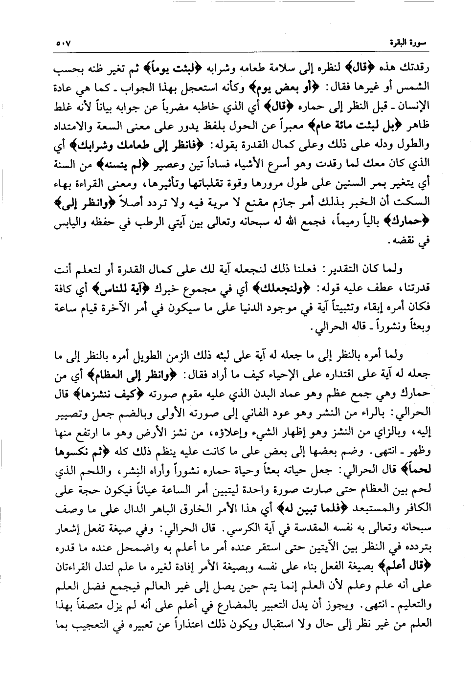 وضم بعضها إلى بعض على ما كانت عليه ينظم ذلك كله ) ثم نكسوها لحماً ( قال الحرالي : جعل حياته بعثاً وحياة حماره نشوراً وأراه النشر ، واللحم الذي لحم بين العظام حتى صارت صورة واحدة ليتبين أمر الساعة عياناً فيكون حجة على الكافر والمستبعد ) فلما تبين له ) أي هذا الأمر الخارق الباهر الدال على ما وصف سبحانه وتعالى به نفسه المقدسة في ىية الكرسي .