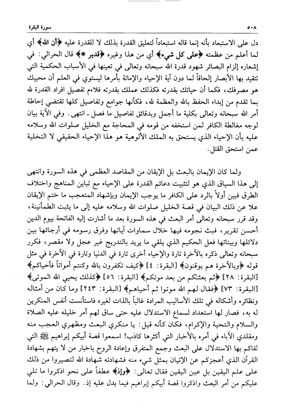 ولما كان الإيمان بالبعث بل الإيقان من المقاصد العظمة في هذه السورة وانتهى إلى هذا السياق الذي هو لتثبيت دعائم القدرة على الإحياء مع تباين المناهج واختلاف الطرق فبين أولاً بالرد على الكافر ما يوجب الإيمان وبإشهاد المتعجب ما ختم الإيقان علا عن ذلك البيان في قصة الخيل صلوات الله وسلامه عليه إلى ما يثبت الطمأنينة ، وقد قرر سبحانه وتعالى أمر البعث في هذه السورة بعد ما أشارت إليه الفاتحة بيوم الدين أحسن تقرير ، فبث نجومه فيها خلال سماوات آياتها وفرق رسومه في أرجائها بين دلائلها وبيناتها فعل الحكيم الذي يلقي ما يريد بالتدريج غير عجل ولا مقصر ، فكرر سبحانه وتعالى ذكره بالآخرة تارة والإحياء أخرى تارة في الدنيا وتارة في الآخرة في مثل قوله
