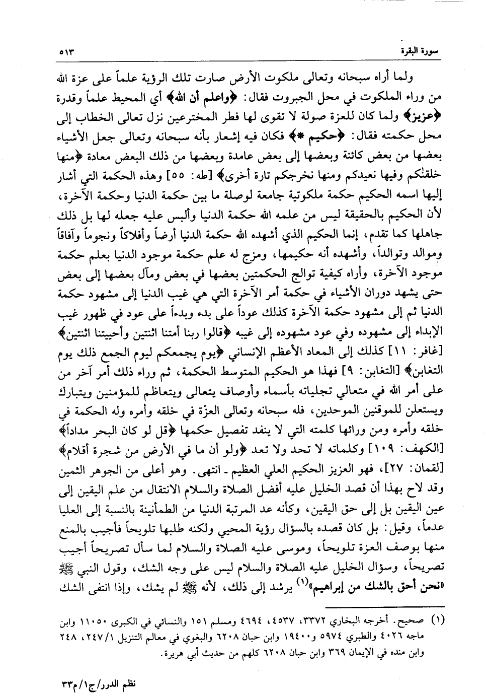 وهو أعلى من الجوهر الثمين وقد لاح بهذا أن قصد الخليل عليه أفضل الصلاة والسلام الانتقال من علم اليقين إلى عين اليقين بل إلى حق اليقين ، وكأنه عد المرتبة الدنيا من الطمأنينة بالنسبة غلى العليا عدماً ، وقيل : بل كان قصده بالسؤال رؤية المحيي ولكنه طلبها تلويحاً فأجيب بالمنع منها بوصف العزة تلويحاً ، وموسى عليه الصلاة والسلام لما سأل تصريحاً أجيب تصريحاً ، وسؤال الخليل عليه الصلاة والسلام ليس على وجه الشك ، وقول النبي ( صلى الله عليه وسلم ) ( نحن أحق بالشك من إبراهيم ) يرشد إلى ذلك ، لأنه ( صلى الله عليه وسلم ) لم يشك ، وإذا انتفى الشك