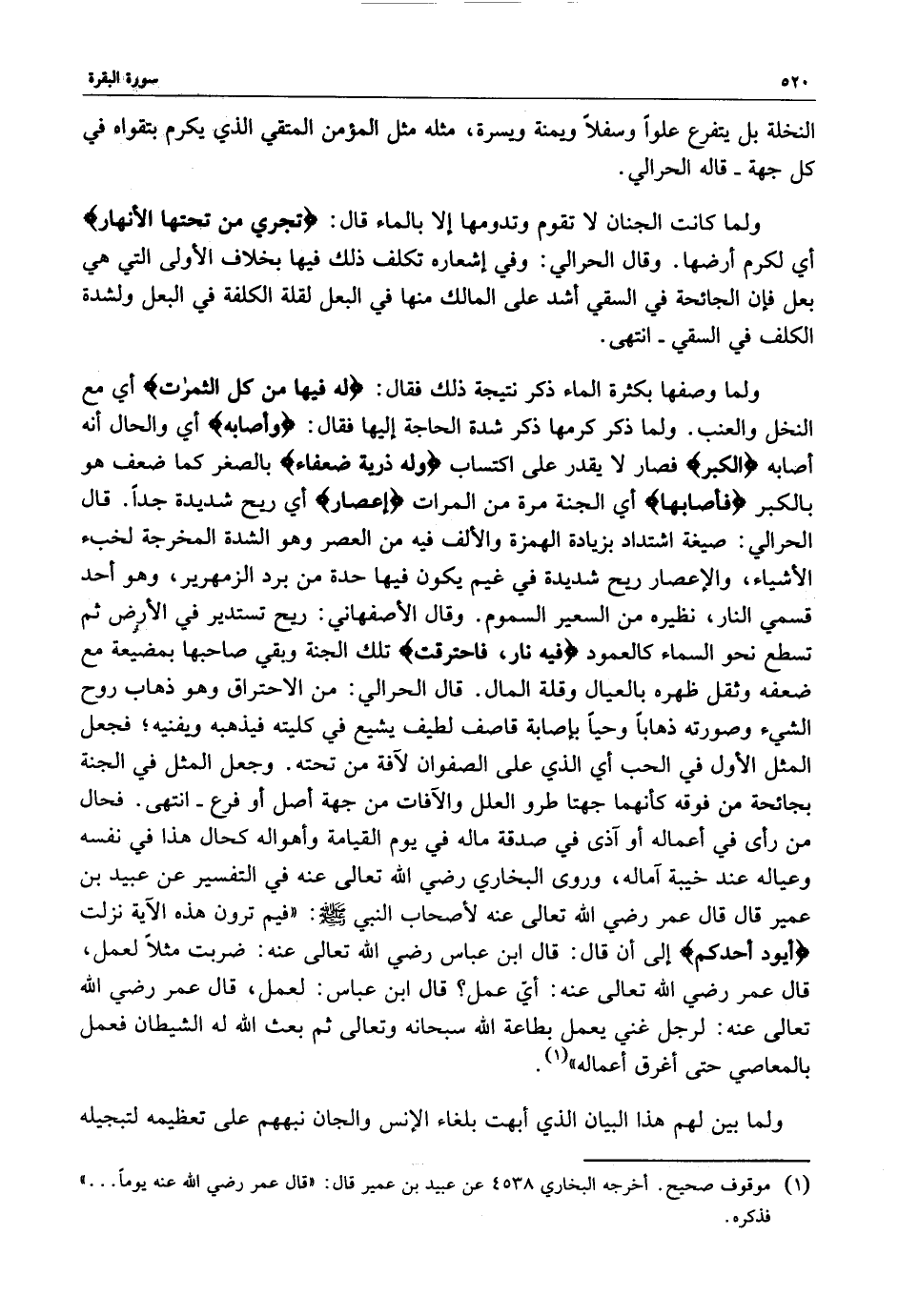 فحال من رأى في أعماله أو آذى في صدقة ماله في يوم القيامة وأهواله كحال هذا في نفسه وعياله عند خيبة آماله ، وروى البخاري رضي الله تعالى عنه في التفسير عن عبيد بن عمير قال قال عمر رضي الله تعالى عنه لأصحاب النبي ( صلى الله عليه وسلم ) : ( فيم ترون هذه الآية نزلت ) أيود أحدكم ( إلى أن قال : قال ابن عباس رضي الله تعالى عنه : ضربت مثلاً لعمل ، قال عمر رضي الله تعالى عنه : أيّ عمل ؟ قال ابن عباس : لعمل ، قال عمر رضي الله تعالى عنه : لرجل غني يعمل بطاعة الله سبحانه وتعالى ثم بعث الله له الشيطان فعمل بالمعاصي حتى أغرق أعماله ) .