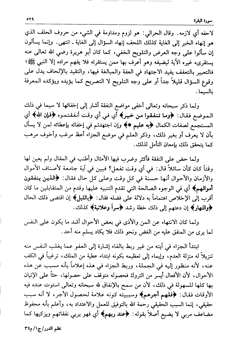 ابتدأ الجزاء في آيته من غير ربط بالفاء إشارة إلى العفو عما يغلب النفس منه تنزيلاً له منزلة العدم ، وإيماء إلى تعظيمه بكونه ابتداء عطية من الملك ، ترغيباً في الكف عنه ، لأنه منظور إليه في الجملة ، وربط الجزاء في هذه إعلاماً بأنه مسبب عن هذه الأحوال ، لأن الأفعال أيسر من التروك فحصوله متوقف على حصولها ، حثاً على الإتيان بها كلها للسهولة في ذلك ، لأن من سمح بالإنفاق لله سبحانه وتعالى استوت عنده فيه الأوقات فقال : ( فلهم أجرهم ( وسببيته كونه علامة لحصول الأجر ، لا أنه سبب حقيقي ، إنما السبب الحقيقي رحمة الله بالتوفيق للعمل والاعتداد به ، وأعلم بأنه محفوظ مضاعف مربي لا يضيع أصلاً بقوله : ( عند ربهم ) أي فهو يربي نفقاتهم ويزكيها كما