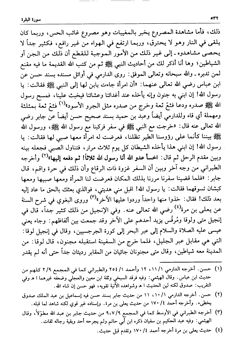 ذلك ، فأما مشاهدة المصروع يخبر بالمغيبات وهو مصروع غائب الحس ، وربما كان يلقى في النار وهو لا يحترق ، وربما ارتفع في الهواء من غير رافع ، فكثير جداً لا يحصى مشاهدوه - إلى غير ذلك من الأمور الموجبة للقطع أن ذلك من الجن أو الشياطين ؛ وها أنا أذكر لك من أحاديث النبي ( صلى الله عليه وسلم ) ثم من كتب الله القديمة ما فيه مقنع لمن تدبره - والله سبحانه وتعالى الموفق : روى الدارمي في أوائل مسنده بسند حسن عن ابن عباس رضي الله تعالى عنهما : ( أن امرأة جاءت بابن لها إلى النبي ( صلى الله عليه وسلم ) فقالت : يا رسول الله إن ابني به جنون وإنه يأخذه عند أغدائنا وعشائنا فيخبث علينا ، فمسح رسول الله ( صلى الله عليه وسلم ) صدره ودعا فثعّ ثعة وخرج من صدره مثل الجرو الأسود ) فثعّ ثعة بمثلثة ومهملة أي قاء وللدارمي أيضاً وعبد بن حميد بسند صحيح حسن أيضاً عن جابر رضي الله تعالى عنه قال : ( خرجت مع النبي ( صلى الله عليه وسلم ) في سفر فركبنا مع رسول الله ( صلى الله عليه وسلم ) ، ورسول الله ( صلى الله عليه وسلم ) بيننا كأنما على رؤوسنا الطير تظلنا ، فعرضت له امرأة معها صبي لها فقالت : يا رسول الله إن ابني هذا يأخذه الشيطان كل يوم ثلاث مرار ، فتناول الصبي فجعله بينه وبين مقدم الرحل ثم قال : ( اخسأ عدو الله أنا رسول الله ثلاثاً ثم دفعه إليها ( وأخرجه الطبراني من وجه آخر وبين أن السفر غزوة ذات الرقاع وأن ذلك في حرة واقم ، قال جابر : ( فلما قضينا سفرنا مررنا بذلك المكان بذلك المكان فعرضت لنا المرأة ومعها صبيها ومعها كبشان تسوقهما فقالت : يا رسول الله اقبل مني هديتي ، فوالذي بعثك بالحق ما عاد إليه بعد ذلك فقال : خذوا منها واحداً وردوا عليها الآخر ( وروى البغوي في شرح السنة عن يعلى بن مرة رضي الله تعالى عنه .