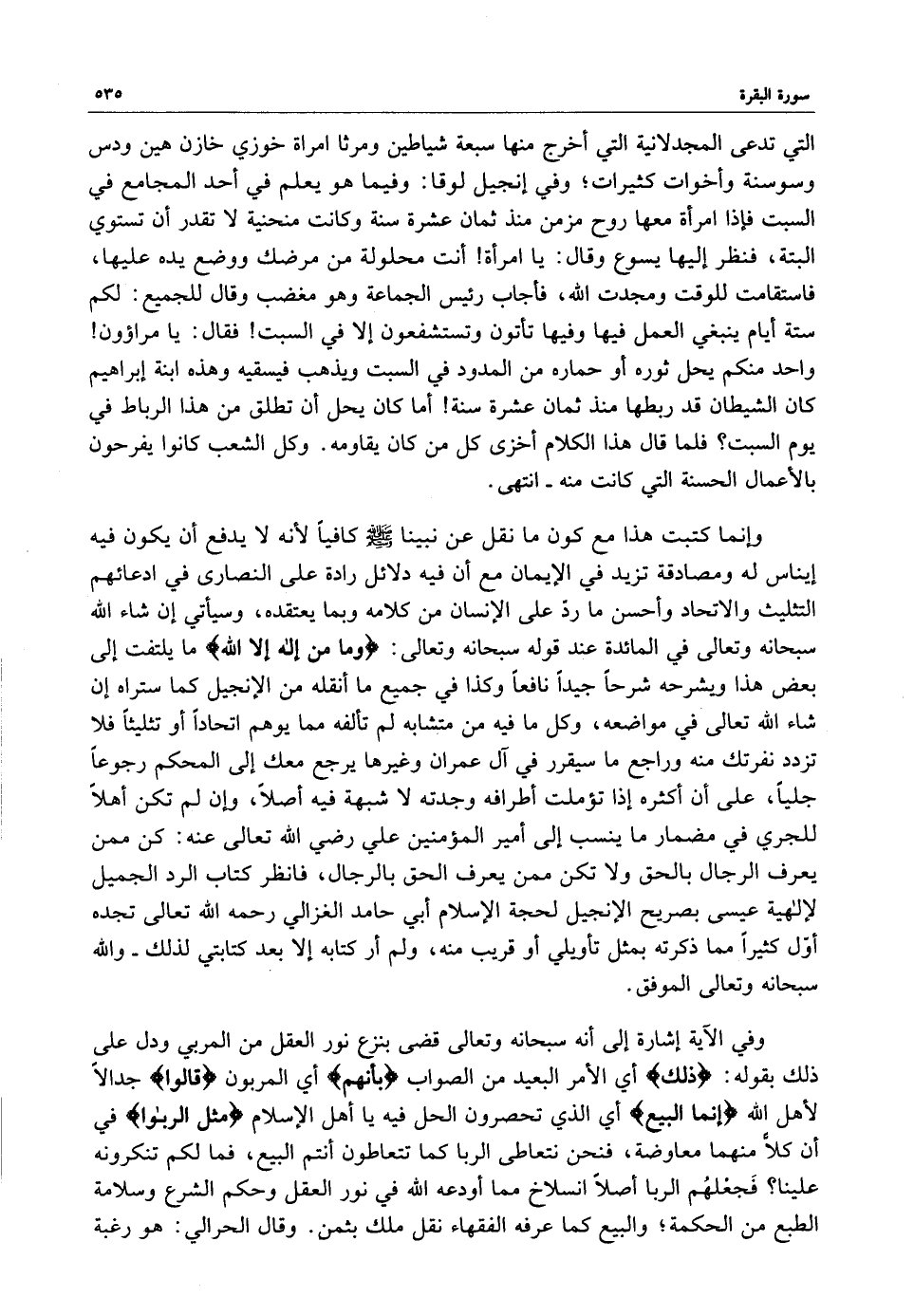وإنما كتبت هذا مع كون ما نقل عن نبينا ( صلى الله عليه وسلم ) كافياً لأنه لا يدفع أن يكون فيه إيناس له ومصادقة تزيد في الإيمان مع أن فيه دلائل رادة على النصارى في ادعائهم التثليث والاتحاد وأحسن ما ردّ على الإنسان من كلامه وبما يعتقده ، وسيأتي إن شاء الله سبحانه وتعالى في المائدة عند قوله سبحانه وتعالى : ( وما من إله إلا الله ( ما يلتفت إلى بعض هذا ويشرحه شرحاً جيداً نافعاً وكذا في جميع ما أنقله من الإنجيل كما ستراه إن شاء الله تعالى في مواضعه ، وكل ما فيه من متشابه لم تألفه مما يوهم اتحاداً أو تثليثاً فلا تزدد نفرتك منه وراجع ما سيقرر في آل عمران وغيرها يرجع معك إلى المحكم رجوعاً جلياً ، على أن أكثره إذا تؤملت أطرافه وجدته لا شبهة فيه أصلاً ، وإن لم تكن أهلاً للجري في مضمار ما ينسب إلى أمير المؤمنين علي رضي الله تعالى عنه : كن ممن يعرف الرجال بالحق ولا تكن ممن يعرف الحق بالرجال ، فانظر كتاب الرد الجميل لإلهية عيسى بصريح الإنجيل لحجة الإسلام أبي حامد الغزالي رحمه الله تعالى تجده أوّل كثيراً مما ذكرته بمثل تأويلي أو قريب منه ، ولم أر كتابه إلا بعد كتابتي لذلك - والله سبحانه وتعالى الموفق .