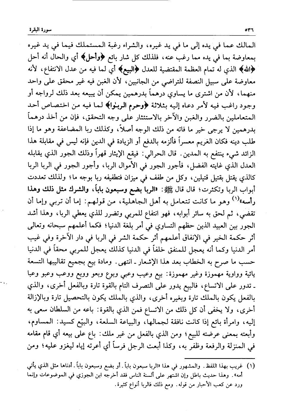 المالك عما في يده إلى ما في يد غيره ، والشراء رغبة المستملك فيما في يد غيره بمعاوضة بما في يده مما رغب عنه ، فلذلك كل شار بائع ) وأحل ) أي والحال أنه أحل ) الله ( الذي له تمام العظمة المقتضية للعدل ) البيع ) أي لما فيه من عدل الانتفاع ، لأنه معاوضة على سبيل النصفة للتراضي من الجانبين ، لأن الغبن فيه غير محقق على واحد منهما ، لأن من اشترى ما يساوي درهماً بدرهمين يمكن أن يبيعه بعد ذلك لرواجه أو وجود راغب فيه لأمر دعاه إليه بثلاثة ) وحرم الربا ( لما فيه من اختصاص أحد المتعاملين بالضرر والغبن والآخر بالاستئثار على وجه التحقيق ، فإن من أخذ درهماً بدرهمين لا يرجى خير ما فاته من ذلك الوجه أصلاً ، وكذلك ربا المضاعفة وهو ما إذا طلب دينه فكان الغريم معسراً فألزمه بالدفع أو الزيادة في الدين فإنه ليس في مقابلة هذا الزائد شيء ينتفع به المدين .