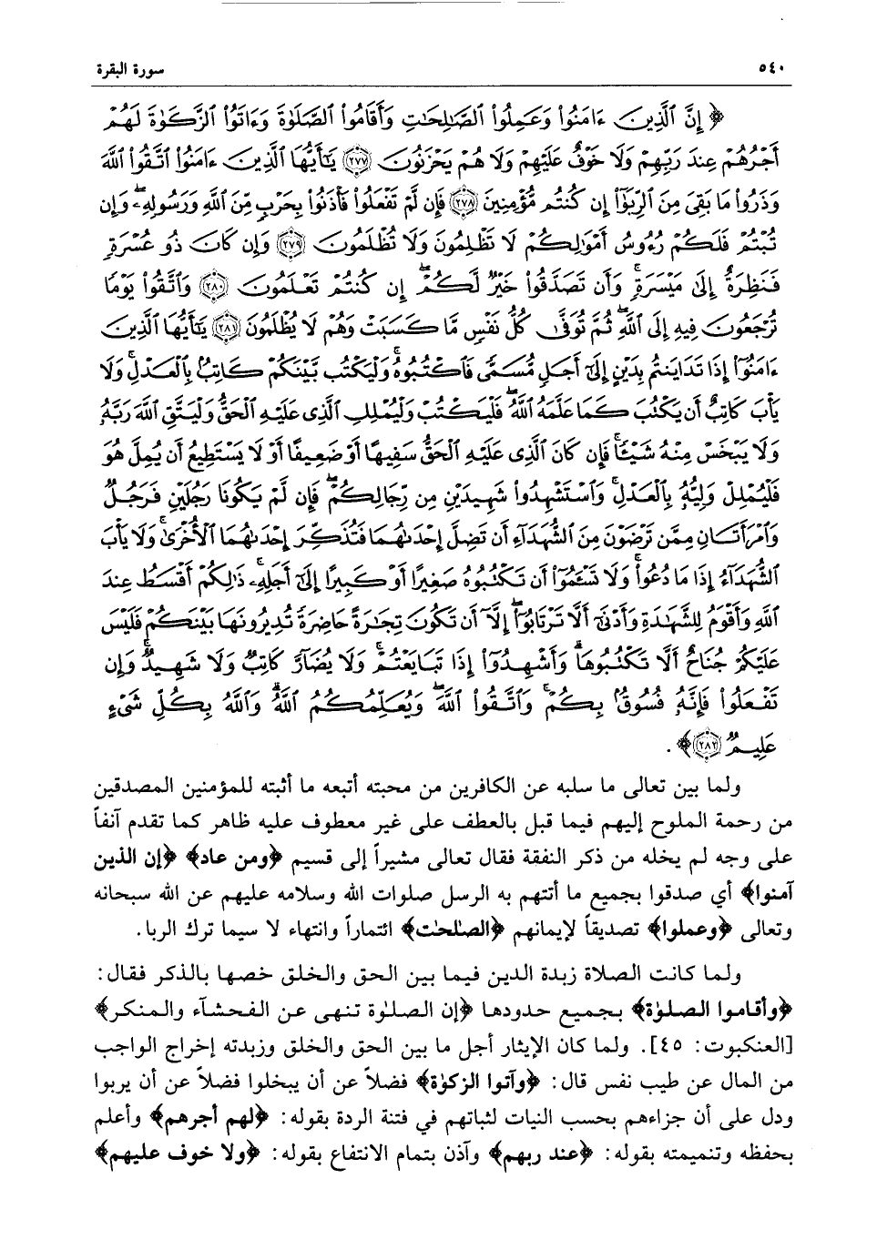) إِنَّ الَّذِينَ آمَنُواْ وَعَمِلُواْ الصَّالِحَاتِ وَأَقَامُواْ الصَّلاَةَ وَآتَوُاْ الزَّكَاةَ لَهُمْ أَجْرُهُمْ عِندَ رَبِّهِمْ وَلاَ خَوْفٌ عَلَيْهِمْ وَلاَ هُمْ يَحْزَنُونَ يأَيُّهَا الَّذِينَ آمَنُواْ اتَّقُواْ اللَّهَ وَذَرُواْ مَا بَقِيَ مِنَ الرِّبَا إِن كُنْتُمْ مُّؤْمِنِينَ فَإِن لَّمْ تَفْعَلُواْ فَأْذَنُواْ بِحَرْبٍ مِّنَ اللَّهِ وَرَسُولِهِ وَإِنْ تُبْتُمْ فَلَكُمْ رُؤُوسُ أَمْوَالِكُمْ لاَ تَظْلِمُونَ وَلاَ تُظْلَمُونَ وَإِن كَانَ ذُو عُسْرَةٍ فَنَظِرَةٌ إِلَى مَيْسَرَةٍ وَأَن تَصَدَّقُواْ خَيْرٌ لَّكُمْ إِن كُنْتُمْ تَعْلَمُونَ وَاتَّقُواْ يَوْماً تُرْجَعُونَ فِيهِ إِلَى اللَّهِ ثُمَّ تُوَفَّى كُلُّ نَفْسٍ مَّا كَسَبَتْ وَهُمْ لاَ يُظْلَمُونَ يأَيُّهَا الَّذِينَ آمَنُواْ إِذَا تَدَايَنتُم بِدَيْنٍ إِلَى أَجَلٍ مُّسَمًّى فَاكْتُبُوهُ وَلْيَكْتُب بَّيْنَكُمْ كَاتِبٌ بِالْعَدْلِ وَلاَ يَأْبَ كَاتِبٌ أَنْ يَكْتُبَ كَمَا عَلَّمَهُ اللَّهُ فَلْيَكْتُبْ وَلْيُمْلِلِ الَّذِي عَلَيْهِ الْحَقُّ وَلْيَتَّقِ اللَّهَ رَبَّهُ وَلاَ يَبْخَسْ مِنْهُ شَيْئاً فَإن كَانَ الَّذِي عَلَيْهِ الْحَقُّ سَفِيهاً أَوْ ضَعِيفاً أَوْ لاَ يَسْتَطِيعُ أَن يُمِلَّ هُوَ فَلْيُمْلِلْ وَلِيُّهُ بِالْعَدْلِ وَاسْتَشْهِدُواْ شَهِيدَيْنِ مِّن رِّجَالِكُمْ فَإِن لَّمْ يَكُونَا رَجُلَيْنِ فَرَجُلٌ وَامْرَأَتَانِ مِمَّن تَرْضَوْنَ مِنَ الشُّهَدَآءِ أَن تَضِلَّ إْحْدَاهُمَا فَتُذَكِّرَ إِحْدَاهُمَا الأُخْرَى وَلاَ يَأْبَ الشُّهَدَآءُ إِذَا مَا دُعُواْ وَلاَ تَسْأَمُواْ أَن تَكْتُبُوهُ صَغِيراً أَو كَبِيراً إِلَى أَجَلِهِ ذَلِكُمْ أَقْسَطُ عِندَ اللَّهِ وَأَقْومُ لِلشَّهَادَةِ وَأَدْنَى أَلاَّ تَرْتَابُواْ إِلاَّ أَن تَكُونَ تِجَارَةً حَاضِرَةً تُدِيرُونَهَا بَيْنَكُمْ فَلَيْسَ عَلَيْكُمْ جُنَاحٌ أَلاَّ تَكْتُبُوهَا وَأَشْهِدُواْ إِذَا تَبَايَعْتُمْ وَلاَ يُضَآرَّ كَاتِبٌ وَلاَ شَهِيدٌ وَإِن تَفْعَلُواْ فَإِنَّهُ فُسُوقٌ بِكُمْ وَاتَّقُواْ اللَّهَ وَيُعَلِّمُكُمُ اللَّهُ وَاللَّهُ بِكُلِّ شَيْءٍ عَلِيمٌ ( ( )