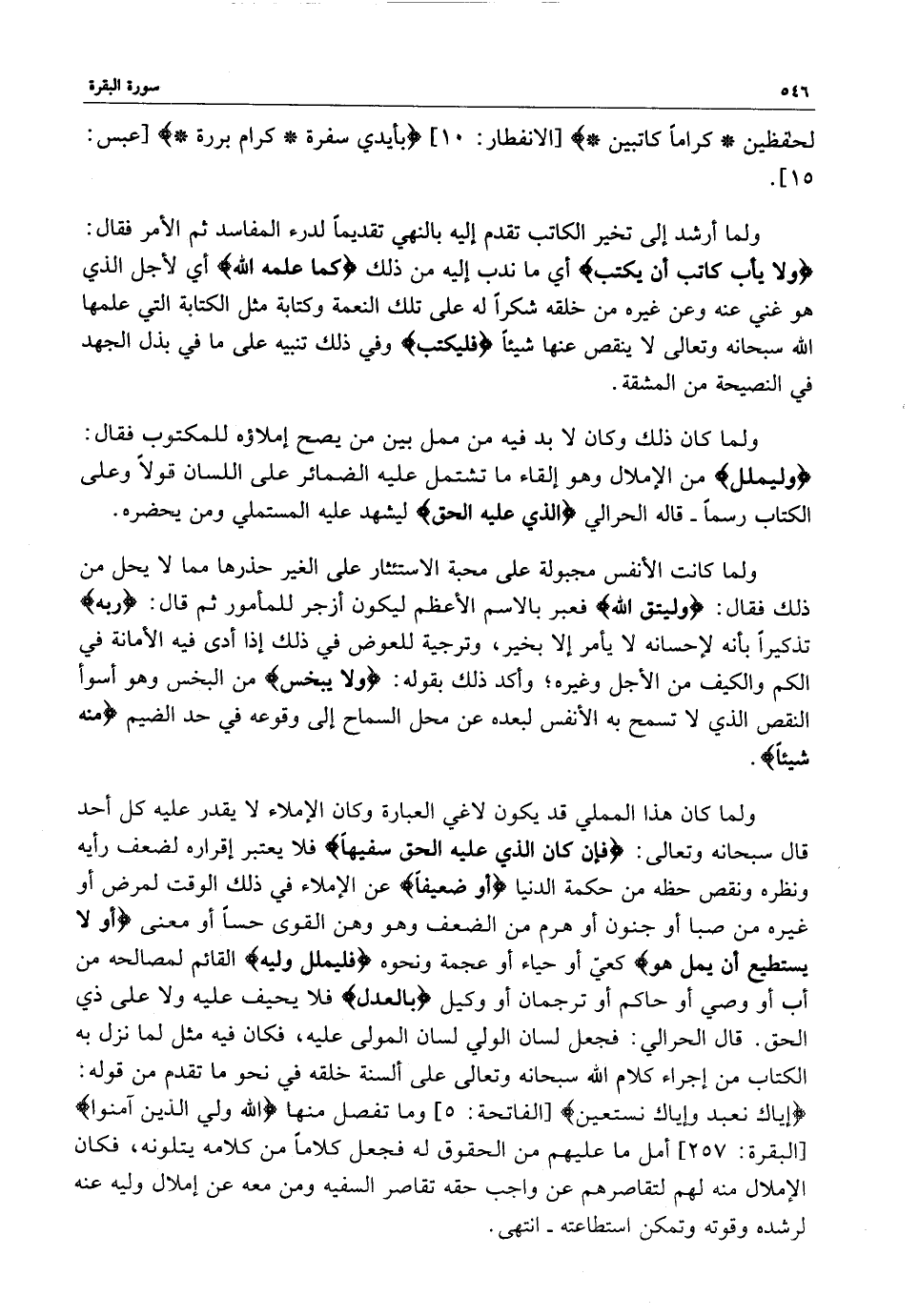 ولما كانت الأنفس مجبولة على محبة الاستئثار على الغير حذرها مما لا يحل من ذلك فقال : ( وليتق الله ( فعبر بالاسم الأعظم ليكون أزجر للمأمور ثم قال : ( ربه ( تذكيراً بأنه لإحسانه لا يأمر إلا بخير ، وترجية للعوض في ذلك إذا أدى فيه الأمانة في الكم والكيف من الأجل وغيره ؛ وأكد ذلك بقوله : ( ولا يبخس ( من البخس وهو أسوأ النقص الذي لا تسمح به الأنفس لبعده عن محل السماح إلى وقوعه في حد الضيم ) منه شيئاً ( ولما كان هذا المملي قد يكون لاغي العبارة وكان الإملاء لا يقدر عليه كل أحد قال سبحانه وتعالى : ( فإن كان الذي عليه الحق سفيهاً ( فلا يعتبر إقراره لضعف رأيه ونظره ونقص حظه من حكمة الدنيا ) أو ضعيفاً ( عن الإملاء في ذلك الوقت لمرض أو غيره من صبا أو جنون أو هرم من الضعف وهو وهن القوى حساً أو معنى ) أو لا يستطيع أن يمل هو ( كعيّ أو حياء أو عجمة ونحوه ) فليملل وليه ( القائم لمصالحه من أب أو وصي أو حاكم أو ترجمان أو وكيل ) بالعدل ( فلا يحيف عليه ولا على ذي الحق .