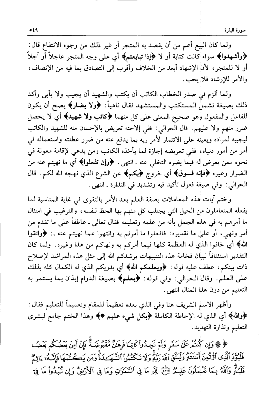 ) وَإِن كُنتُمْ عَلَى سَفَرٍ وَلَمْ تَجِدُواْ كَاتِباً فَرِهَانٌ مَّقْبُوضَةٌ فَإِنْ أَمِنَ بَعْضُكُم بَعْضاً فَلْيُؤَدِّ الَّذِي اؤْتُمِنَ أَمَانَتَهُ وَلْيَتَّقِ اللَّهَ رَبَّهُ وَلاَ تَكْتُمُواْ الشَّهَادَةَ وَمَن يَكْتُمْهَا فَإِنَّهُ آثِمٌ قَلْبُهُ وَاللَّهُ بِمَا تَعْمَلُونَ عَلِيمٌ للَّهِ ما فِي السَّمَاواتِ وَمَا فِي الأَرْضِ وَإِن تُبْدُواْ مَا فِي