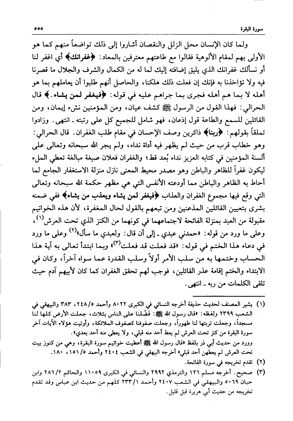 ولما كان الإنسان محل الزلل والنقصان أشاروا إلى ذلك تواضعاً منهم كما هو الأولى بهم لمقام الألوهية فقالوا مع طاعتهم معترفين بالمعاد : ( غفرانك ) أي اغفر لنا أو نسألك غفرانك الذي يليق إضافته إليك لما له من الكمال والشرف والجلال ما قصرنا فيه ولا تؤاخذنا به فإنك إن فعلت ذلك هلكنا ، والحاصل أنهم طلبوا أن يعاملهم بما هو أهله لا بما هم أهله فجرى بما جراهم عليه في قوله : ( فيغفر لمن يشاء ( .