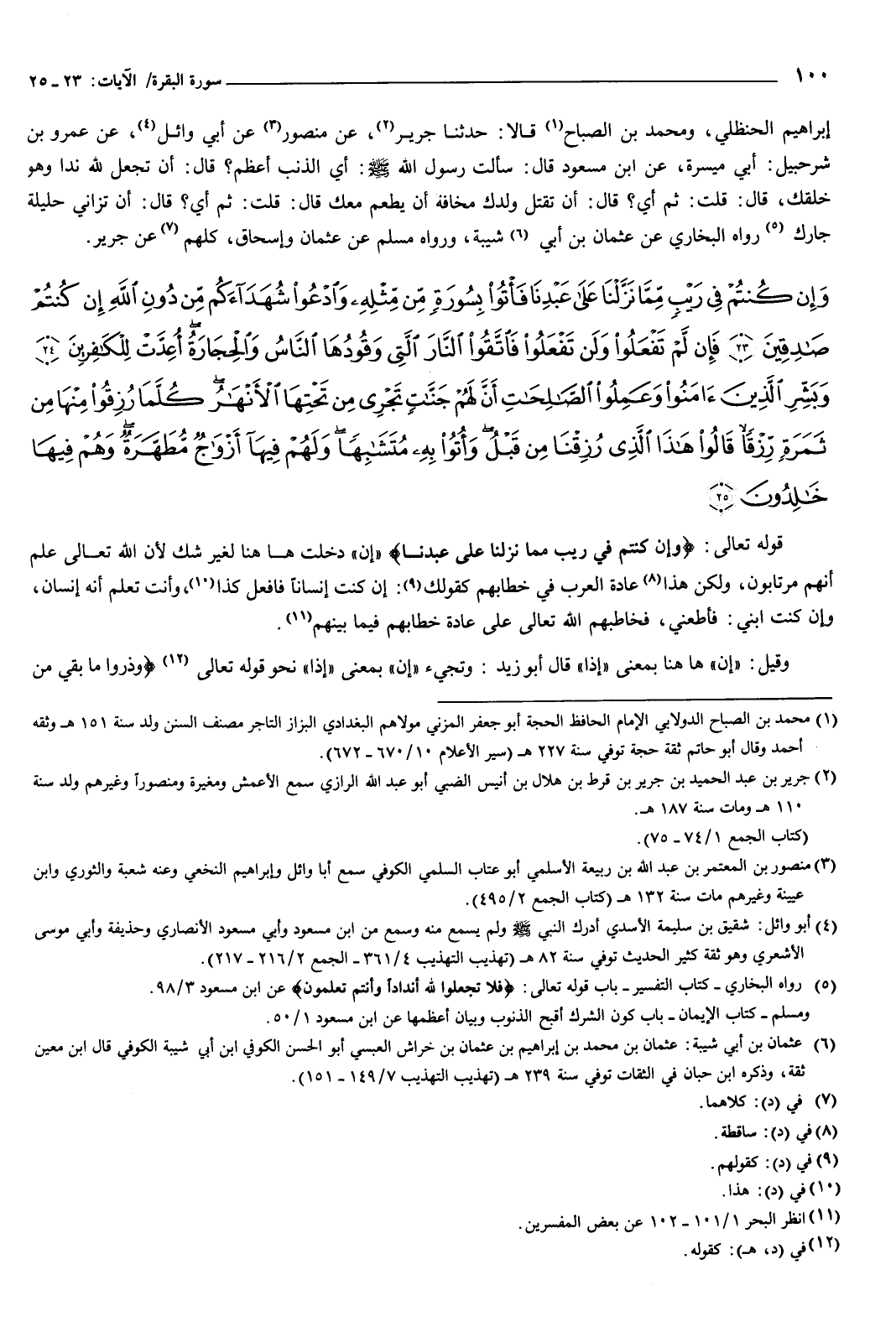 {وَإِنْ كُنْتُمْ فِي رَيْبٍ مِمَّا نَزَّلْنَا عَلَى عَبْدِنَا فَأْتُوا بِسُورَةٍ مِنْ مِثْلِهِ وَادْعُوا شُهَدَاءَكُمْ مِنْ دُونِ اللَّهِ إِنْ كُنْتُمْ صَادِقِينَ {23} فَإِنْ لَمْ تَفْعَلُوا وَلَنْ تَفْعَلُوا فَاتَّقُوا النَّارَ الَّتِي وَقُودُهَا النَّاسُ وَالْحِجَارَةُ أُعِدَّتْ لِلْكَافِرِينَ {24} وَبَشِّرِ الَّذِينَ آمَنُوا وَعَمِلُوا الصَّالِحَاتِ أَنَّ لَهُمْ جَنَّاتٍ تَجْرِي مِنْ تَحْتِهَا الأَنْهَارُ كُلَّمَا رُزِقُوا مِنْهَا مِنْ ثَمَرَةٍ رِزْقًا قَالُوا هَذَا الَّذِي رُزِقْنَا مِنْ قَبْلُ وَأُتُوا بِهِ مُتَشَابِهًا وَلَهُمْ فِيهَا أَزْوَاجٌ مُطَهَّرَةٌ وَهُمْ فِيهَا خَالِدُونَ {25} } [البقرة: 23-25] قوله تعالى: {وَإِنْ كُنْتُمْ فِي رَيْبٍ مِمَّا نَزَّلْنَا عَلَى عَبْدِنَا} [البقرة: 23] : إن: دخلت ههنا لغير شك، لأن الله تعالى علم أنهم مرتابون، ولكن هذا عادة العرب فِي خطابهم كقولك: إن كنت إنسانا فافعل كذا.