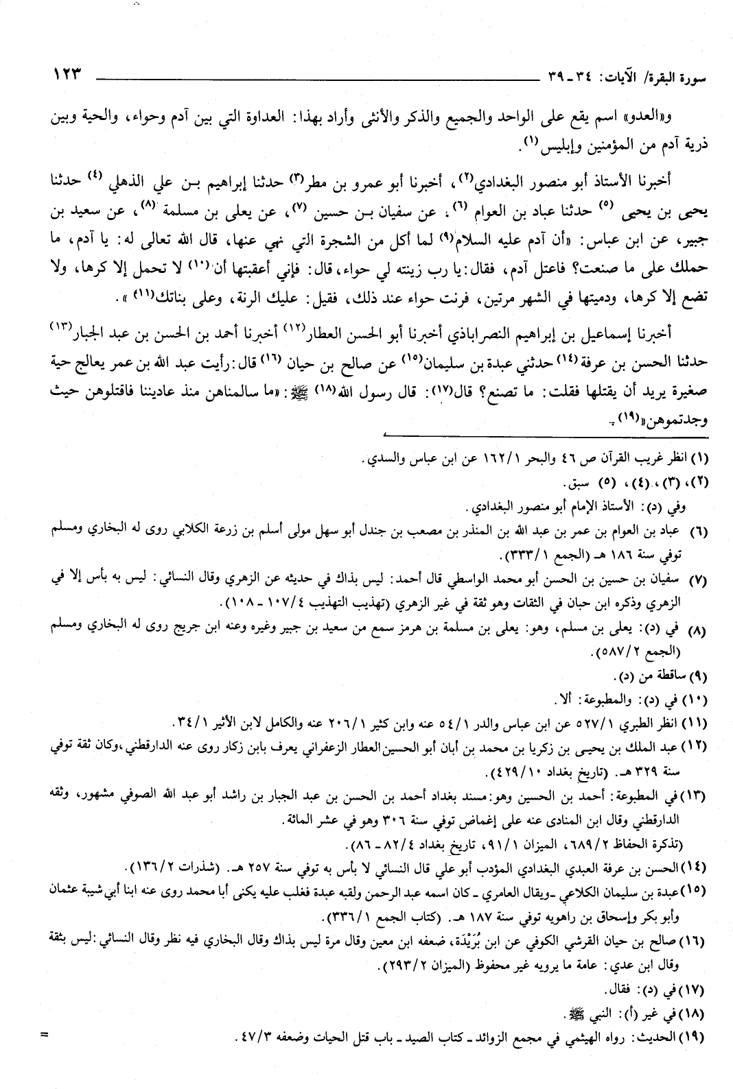 31 - أَخْبَرَنَا الأُسْتَاذُ أَبُو مَنْصُورٍ الْبَغْدَادِيُّ، أَخْبَرَنَا أَبُو عَمْرِو بْنُ مَطَرٍ، حَدَّثَنَا إِبْرَاهِيمُ بْنُ عَلِيٍّ الذُّهْلِيُّ، حَدَّثَنَا يَحْيَى بْنُ يَحْيَى، حَدَّثَنَا عَبَّادُ بْنُ الْعَوَّامِ، عَنْ سُفْيَانَ بْنِ حُسَيْنٍ، عَنْ يَعْلَى بْنِ مَسْلَمَةَ، عَنْ سَعِيدِ بْنِ جُبَيْرٍ، عَنِ ابْنِ عَبَّاسٍ: " أَنَّ آدَمَ عَلَيْهِ السَّلامُ لَمَّا أَكَلَ مِنَ الشَّجَرَةِ الَّتِي نُهِيَ عَنْهَا، قَالَ اللَّهُ تَعَالَى لَهُ: يَا آدَمُ، مَا حَمَلَكَ عَلَى مَا صَنَعْتَ؟ فَاعْتَلَّ آدَمُ، فَقَالَ: يَا رَبِّ زَيَّنَتْهُ لِي حَوَّاءُ، قَالَ: فَإِنِّي أَعْقَبْتُهَا أَنْ لا تَحْمِلَ إِلا كَرْهًا، وَلا تَضَعَ إِلا كَرْهًا، وَدَمَّيْتُهَا فِي الشَّهْرِ مَرَّتَيْنِ، فَرَنَّتْ حَوَّاءُ عِنْدَ ذَلِكَ، فَقِيلَ: عَلَيْكِ الرَّنَّةُ، وَعَلَى بَنَاتِكَ "