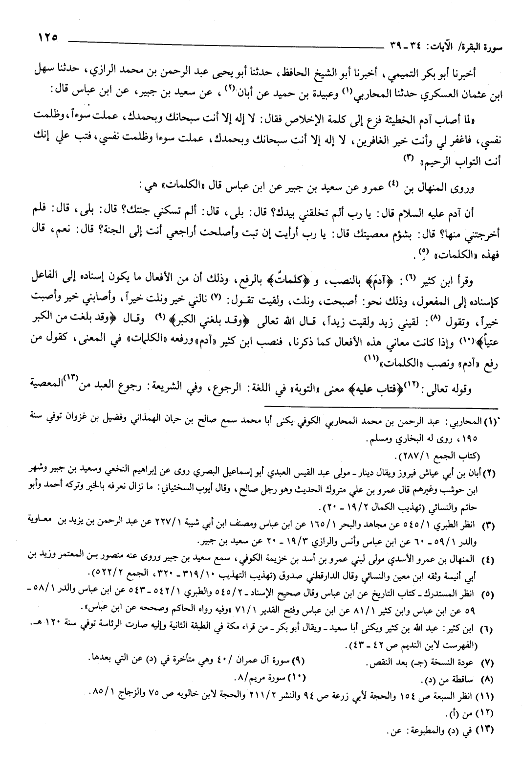 34 - وَرَوَى الْمِنْهَالُ بْنُ عَمْرٍو، عَنْ سَعِيدِ بْنِ جُبَيْرٍ، عَنِ ابْنِ عَبَّاسٍ قَالَ: «الْكَلِمَاتُ» هِيَ: أَنَّ آدَمَ عَلَيْهِ السَّلامُ، قَالَ: يَا رَبِّ أَلَمْ تَخْلُقْنِي بِيَدِكَ؟ قَالَ: بَلَى، قَالَ: أَلَمْ تُسْكِنِّي جَنَّتَكَ؟ قَالَ: بَلَى، قَالَ: فَلِمَ أَخْرَجْتَنِي مِنْهَا؟ قَالَ: بِشُؤْمِ مَعْصِيَتِكَ، قَالَ: يَا رَبِّ، أَرَأَيْتَ إِنْ تُبْتُ وَأَصْلَحْتُ أَرَاجِعِي أَنْتَ إِلَى الْجَنَّةِ؟ قَال: نَعَمْ، قَالَ: فَهَذِهِ «الْكَلِمَاتُ»