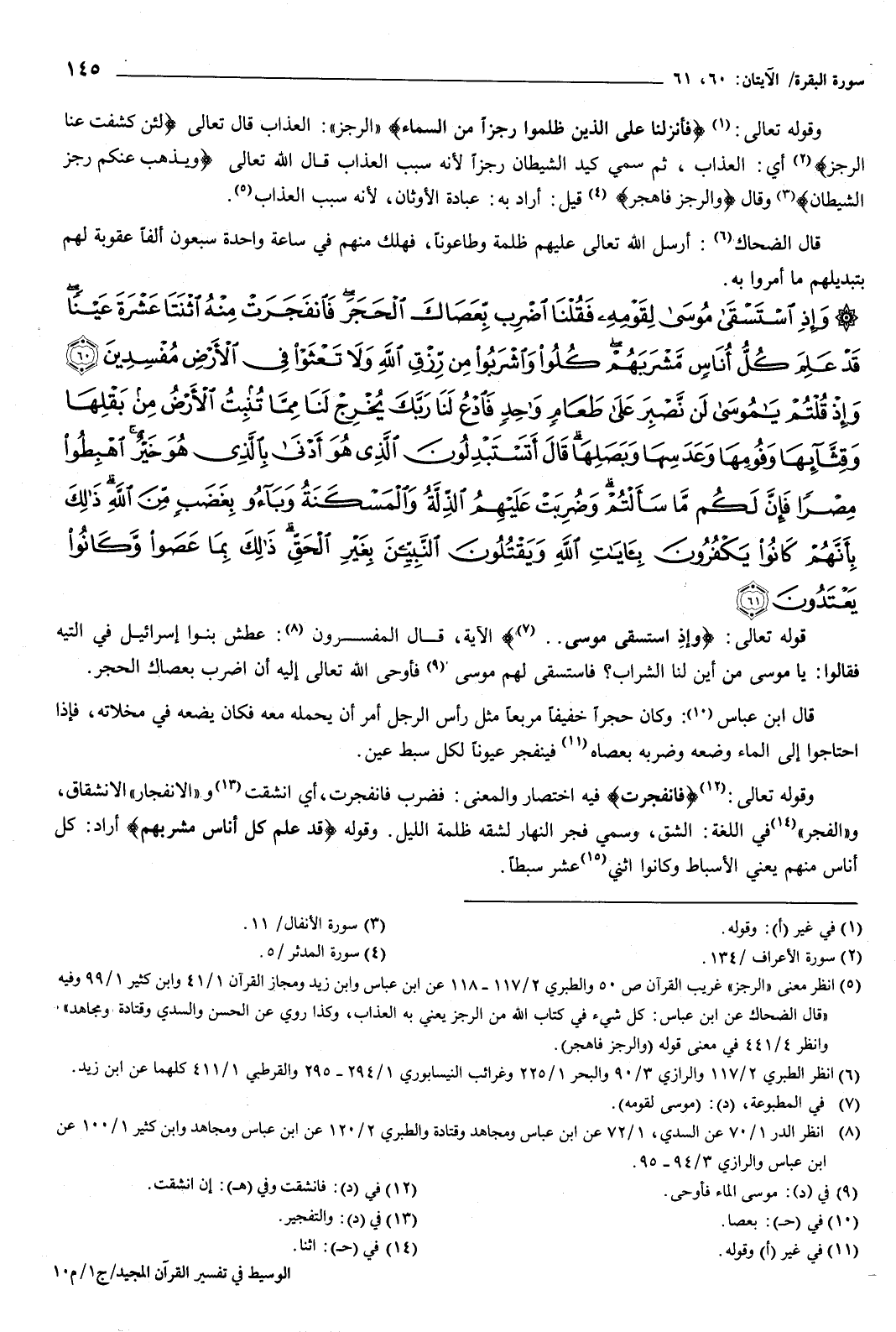 {وَإِذِ اسْتَسْقَى مُوسَى لِقَوْمِهِ فَقُلْنَا اضْرِبْ بِعَصَاكَ الْحَجَرَ فَانْفَجَرَتْ مِنْهُ اثْنَتَا عَشْرَةَ عَيْنًا قَدْ عَلِمَ كُلُّ أُنَاسٍ مَشْرَبَهُمْ كُلُوا وَاشْرَبُوا مِنْ رِزْقِ اللَّهِ وَلا تَعْثَوْا فِي الأَرْضِ مُفْسِدِينَ {60} وَإِذْ قُلْتُمْ يَا مُوسَى لَنْ نَصْبِرَ عَلَى طَعَامٍ وَاحِدٍ فَادْعُ لَنَا رَبَّكَ يُخْرِجْ لَنَا مِمَّا تُنْبِتُ الأَرْضُ مِنْ بَقْلِهَا وَقِثَّائِهَا وَفُومِهَا وَعَدَسِهَا وَبَصَلِهَا قَالَ أَتَسْتَبْدِلُونَ الَّذِي هُوَ أَدْنَى بِالَّذِي هُوَ خَيْرٌ اهْبِطُوا مِصْرًا فَإِنَّ لَكُمْ مَا سَأَلْتُمْ وَضُرِبَتْ عَلَيْهِمُ الذِّلَّةُ وَالْمَسْكَنَةُ وَبَاءُوا بِغَضَبٍ مِنَ اللَّهِ ذَلِكَ بِأَنَّهُمْ كَانُوا يَكْفُرُونَ بِآيَاتِ اللَّهِ وَيَقْتُلُونَ النَّبِيِّينَ بِغَيْرِ الْحَقِّ ذَلِكَ بِمَا عَصَوْا وَكَانُوا يَعْتَدُونَ {61} } [البقرة: 60-61] قوله تعالى: {وَإِذِ اسْتَسْقَى مُوسَى} [البقرة: 60] الآية، قال المفسرون: عطش بنو إسرائيل فِي التيه، فقالوا: يا موسى، من أين لنا الشراب؟ فاستسقى لهم موسى، فأوحى الله تعالى إليه أن اضرب بعصاك الحجر.