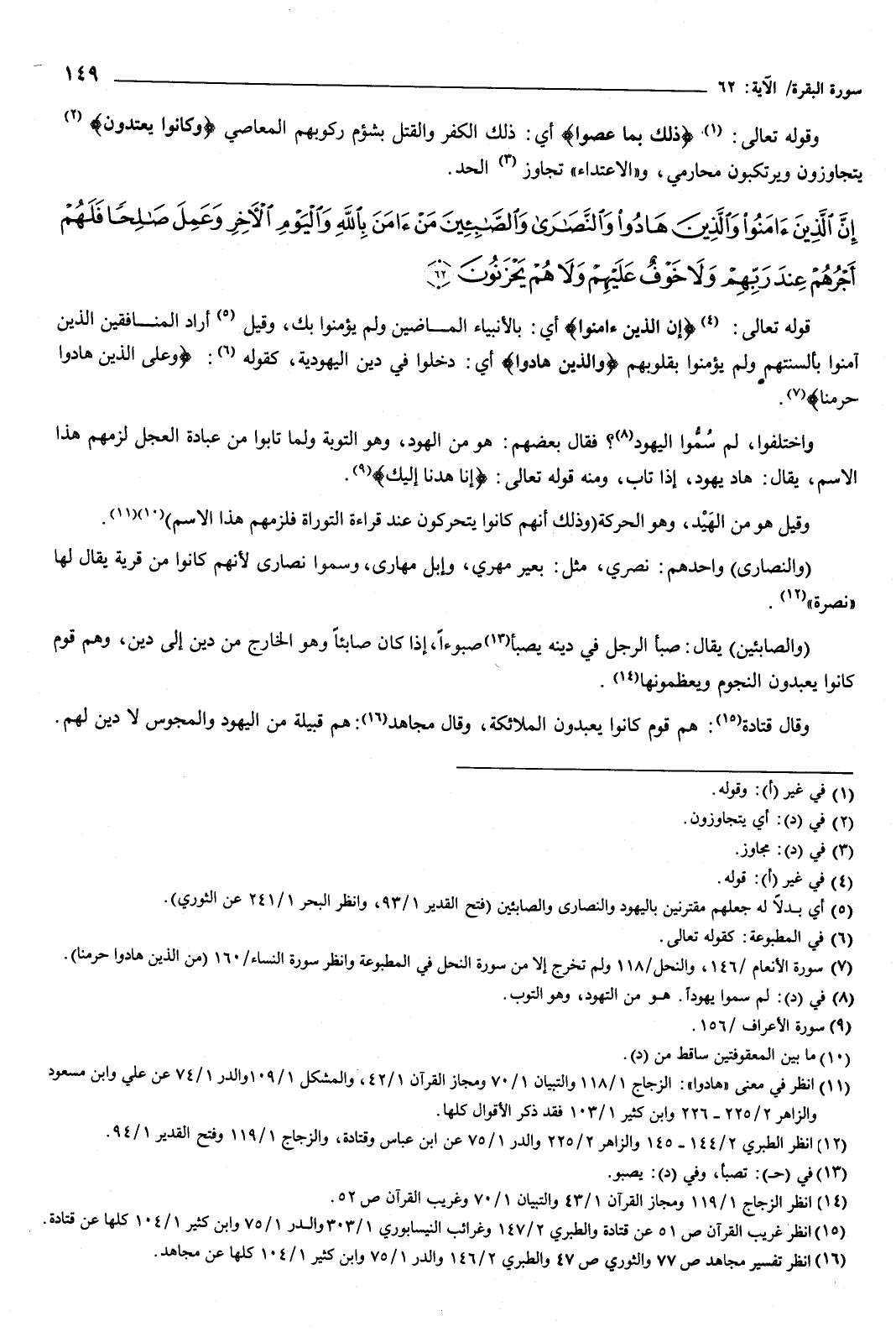 {إِنَّ الَّذِينَ آمَنُوا وَالَّذِينَ هَادُوا وَالنَّصَارَى وَالصَّابِئِينَ مَنْ آمَنَ بِاللَّهِ وَالْيَوْمِ الآخِرِ وَعَمِلَ صَالِحًا فَلَهُمْ أَجْرُهُمْ عِنْدَ رَبِّهِمْ وَلا خَوْفٌ عَلَيْهِمْ وَلا هُمْ يَحْزَنُونَ} [البقرة: 62] قوله تعالى: إن الذين آمنوا أي: بالأنبياء الماضين ولم يؤمنوا بك، وقيل: أراد المنافقين الذين آمنوا بألسنتهم ولم يؤمنوا بقلوبهم، والذين هادوا أي: دخلوا فِي دين اليهودية، كقوله: {وَعَلَى الَّذِينَ هَادُوا حَرَّمْنَا} [الأنعام: 146] .