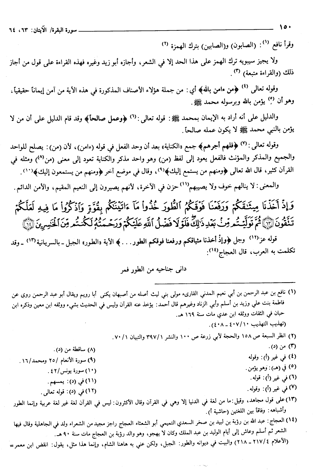 {وَإِذْ أَخَذْنَا مِيثَاقَكُمْ وَرَفَعْنَا فَوْقَكُمُ الطُّورَ خُذُوا مَا آتَيْنَاكُمْ بِقُوَّةٍ وَاذْكُرُوا مَا فِيهِ لَعَلَّكُمْ تَتَّقُونَ {63} ثُمَّ تَوَلَّيْتُمْ مِنْ بَعْدِ ذَلِكَ فَلَوْلا فَضْلُ اللَّهِ عَلَيْكُمْ وَرَحْمَتُهُ لَكُنْتُمْ مِنَ الْخَاسِرِينَ {64} } [البقرة: 63-64] قوله عز وجل: {وَإِذْ أَخَذْنَا مِيثَاقَكُمْ وَرَفَعْنَا فَوْقَكُمُ الطُّورَ} [البقرة: 63] الآية، الطور: الجبل، بالسريانية، وقد تكلمت به العرب، قال العجاج: