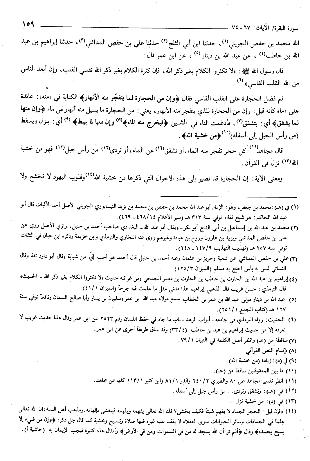 ثم فضل الحجارة على القلب القاسي فقال: {وَإِنَّ مِنَ الْحِجَارَةِ لَمَا يَتَفَجَّرُ مِنْهُ الأَنْهَارُ} [البقرة: 74] الكناية فِي منه عائدة على ما، كأنه قيل: وإن من الحجارة للذي يتفجر منه الأنهار، يعني: من الحجارة ما يسيل منه أنهار من ماء، {وَإِنَّ مِنْهَا لَمَا يَشَّقَّقُ} [البقرة: 74] أي: يتشقق، فأدغمت التاء فِي الشين، {فَيَخْرُجُ مِنْهُ الْمَاءُ وَإِنَّ مِنْهَا لَمَا يَهْبِطُ} [البقرة: 74] أي: ينزل ويسقط من رأس الجبل إلى أسفله، {مِنْ خَشْيَةِ اللَّهِ} [البقرة: 74] قال مجاهد: كل حجر تفجر منه الماء، أو تشقق عن الماء، أو تردى من رأس جبل، فهو من خشية الله نزل فِي القرآن.