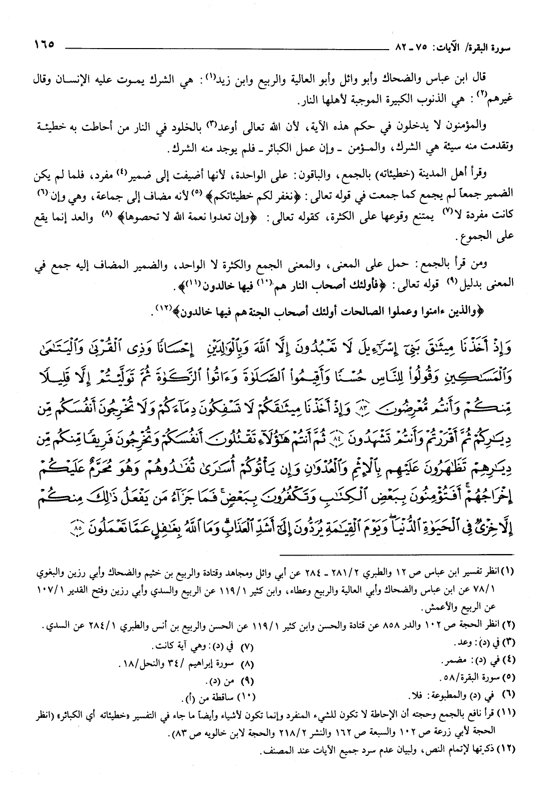 {وَإِذْ أَخَذْنَا مِيثَاقَ بَنِي إِسْرَائِيلَ لا تَعْبُدُونَ إِلا اللَّهَ وَبِالْوَالِدَيْنِ إِحْسَانًا وَذِي الْقُرْبَى وَالْيَتَامَى وَالْمَسَاكِينِ وَقُولُوا لِلنَّاسِ حُسْنًا وَأَقِيمُوا الصَّلاةَ وَآتُوا الزَّكَاةَ ثُمَّ تَوَلَّيْتُمْ إِلا قَلِيلا مِنْكُمْ وَأَنْتُمْ مُعْرِضُونَ {83} وَإِذْ أَخَذْنَا مِيثَاقَكُمْ لا تَسْفِكُونَ دِمَاءَكُمْ وَلا تُخْرِجُونَ أَنْفُسَكُمْ مِنْ دِيَارِكُمْ ثُمَّ أَقْرَرْتُمْ وَأَنْتُمْ تَشْهَدُونَ {84} ثُمَّ أَنْتُمْ هَؤُلاءِ تَقْتُلُونَ أَنْفُسَكُمْ وَتُخْرِجُونَ فَرِيقًا مِنْكُمْ مِنْ دِيَارِهِمْ تَظَاهَرُونَ عَلَيْهِمْ بِالإِثْمِ وَالْعُدْوَانِ وَإِنْ يَأْتُوكُمْ أُسَارَى تُفَادُوهُمْ وَهُوَ مُحَرَّمٌ عَلَيْكُمْ إِخْرَاجُهُمْ أَفَتُؤْمِنُونَ بِبَعْضِ الْكِتَابِ وَتَكْفُرُونَ بِبَعْضٍ فَمَا جَزَاءُ مَنْ يَفْعَلُ ذَلِكَ مِنْكُمْ إِلا خِزْيٌ فِي الْحَيَاةِ الدُّنْيَا وَيَوْمَ الْقِيَامَةِ يُرَدُّونَ إِلَى أَشَدِّ الْعَذَابِ وَمَا اللَّهُ بِغَافِلٍ عَمَّا تَعْمَلُونَ {85}