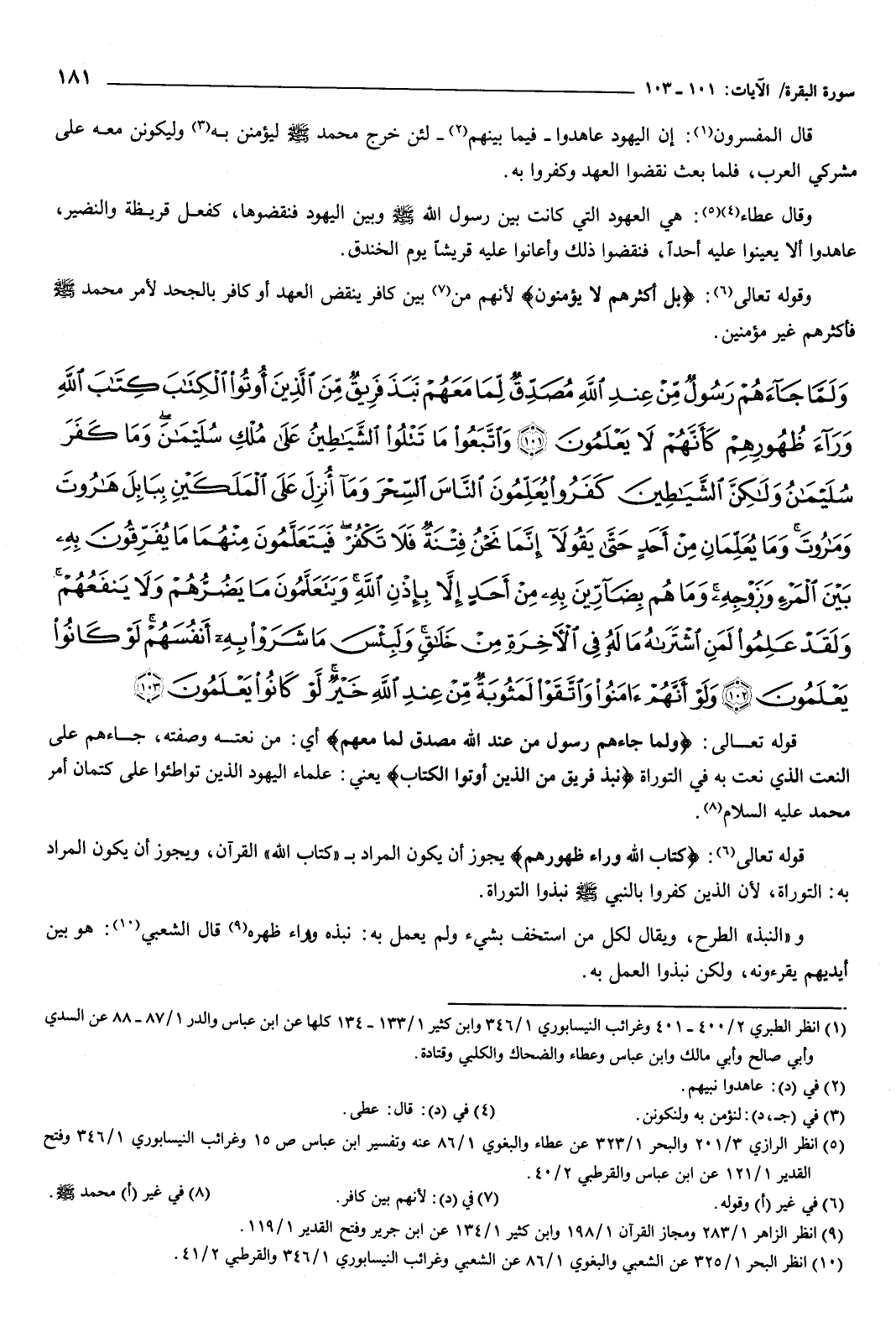 {وَلَمَّا جَاءَهُمْ رَسُولٌ مِنْ عِنْدِ اللَّهِ مُصَدِّقٌ لِمَا مَعَهُمْ نَبَذَ فَرِيقٌ مِنَ الَّذِينَ أُوتُوا الْكِتَابَ كِتَابَ اللَّهِ وَرَاءَ ظُهُورِهِمْ كَأَنَّهُمْ لا يَعْلَمُونَ {101} وَاتَّبَعُوا مَا تَتْلُو الشَّيَاطِينُ عَلَى مُلْكِ سُلَيْمَانَ وَمَا كَفَرَ سُلَيْمَانُ وَلَكِنَّ الشَّيَاطِينَ كَفَرُوا يُعَلِّمُونَ النَّاسَ السِّحْرَ وَمَا أُنْزِلَ عَلَى الْمَلَكَيْنِ بِبَابِلَ هَارُوتَ وَمَارُوتَ وَمَا يُعَلِّمَانِ مِنْ أَحَدٍ حَتَّى يَقُولا إِنَّمَا نَحْنُ فِتْنَةٌ فَلا تَكْفُرْ فَيَتَعَلَّمُونَ مِنْهُمَا مَا يُفَرِّقُونَ بِهِ بَيْنَ الْمَرْءِ وَزَوْجِهِ وَمَا هُمْ بِضَارِّينَ بِهِ مِنْ أَحَدٍ إِلا بِإِذْنِ اللَّهِ وَيَتَعَلَّمُونَ مَا يَضُرُّهُمْ وَلا يَنْفَعُهُمْ وَلَقَدْ عَلِمُوا لَمَنِ اشْتَرَاهُ مَا لَهُ فِي الآخِرَةِ مِنْ خَلاقٍ وَلَبِئْسَ مَا شَرَوْا بِهِ أَنْفُسَهُمْ لَوْ كَانُوا يَعْلَمُونَ {102} وَلَوْ أَنَّهُمْ آمَنُوا وَاتَّقَوْا لَمَثُوبَةٌ مِنْ عِنْدِ اللَّهِ خَيْرٌ لَوْ كَانُوا يَعْلَمُونَ {103} } [البقرة: 101-103] قوله تعالى: {وَلَمَّا جَاءَهُمْ رَسُولٌ مِنْ عِنْدِ اللَّهِ مُصَدِّقٌ لِمَا مَعَهُمْ} [البقرة: 101] أي: من نعته وصفته، جاءهم على النعت الذي نعت به فِي التوراة، {نَبَذَ فَرِيقٌ مِنَ الَّذِينَ أُوتُوا الْكِتَابَ} [البقرة: 101] يعني علماء اليهود الذين تواطئوا على كتمان أمر محمد عليه السلام.