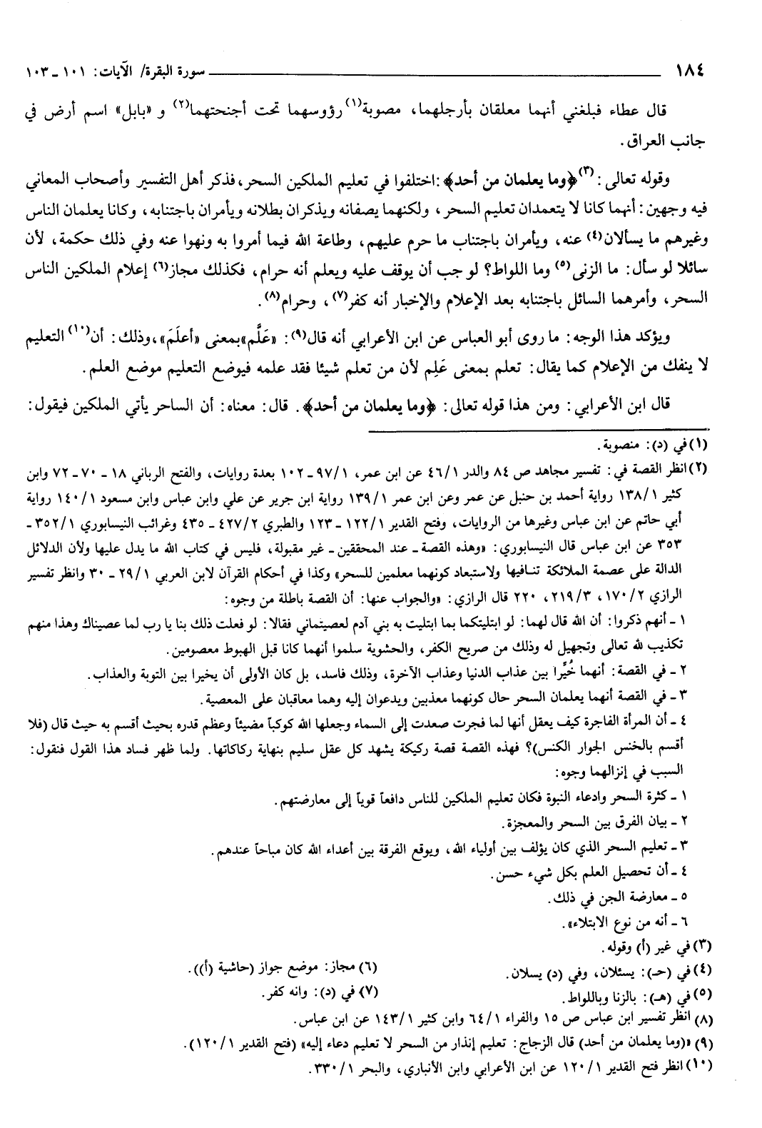 وقوله تعالى: {وَمَا يُعَلِّمَانِ مِنْ أَحَدٍ} [البقرة: 102] اختلفوا فِي تعليم الملكين السحر، فذكر أهل التفسير وأصحاب المعاني فِيهِ وجهين: أنهما كانا لا يتعمدان تعليم السحر، ولكنهما يصفانه، ويذكران بطلانه، ويأمران باجتنابه، وكانا يعلمان الناس وغيرهم ما يسألان عنه، ويأمران باجتناب ما حرم عليهم، وطاعة الله فيما أمروا به ونهوا عنه، وفي ذلك حكمة، لأن سائلا لو سأل: ما الزنى وما اللواط؟ لوجب أن يوقف عليه ويعلم أنه حرام، فكذلك مجاز إعلام الملكين الناس السحر، وأمرهما السائل باجتنابه بعد الإعلام والإخبار أنه كفر وحرام.