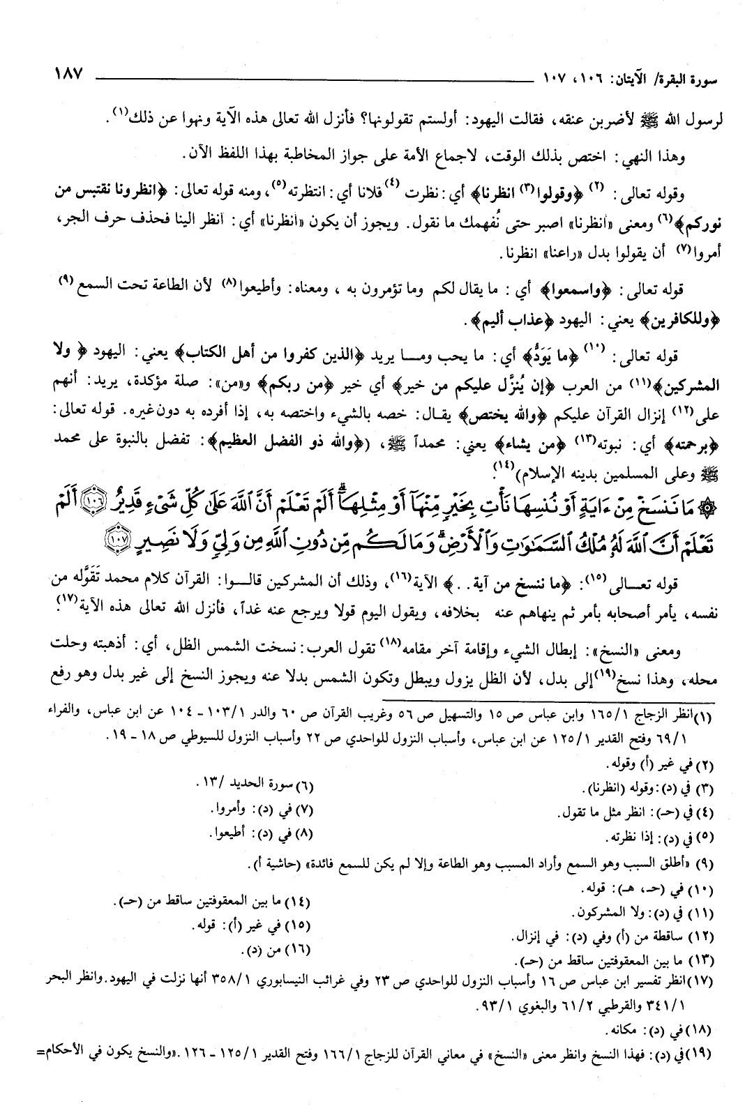 {مَا نَنْسَخْ مِنْ آيَةٍ أَوْ نُنْسِهَا نَأْتِ بِخَيْرٍ مِنْهَا أَوْ مِثْلِهَا أَلَمْ تَعْلَمْ أَنَّ اللَّهَ عَلَى كُلِّ شَيْءٍ قَدِيرٌ {106} أَلَمْ تَعْلَمْ أَنَّ اللَّهَ لَهُ مُلْكُ السَّمَوَاتِ وَالأَرْضِ وَمَا لَكُمْ مِنْ دُونِ اللَّهِ مِنْ وَلِيٍّ وَلا نَصِيرٍ {107} } [البقرة: 106-107] قوله تعالى: {مَا نَنْسَخْ مِنْ آيَةٍ} [البقرة: 106] الآية، وذلك أن المشركين قالوا: القرآن كلام محمد تقوَّله من نفسه، يأمر أصحابه بأمر، ثم ينهاهم عنه بخلافه، ويقول اليوم قولا ويرجع عنه غدا.
