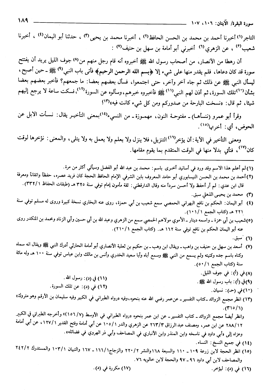 التَّاجِرُ، أَخْبَرَنَا أَحْمَدُ بْنُ مُحَمَّدِ بْنِ الْحَسَنِ الْحَافِظُ، أَخْبَرَنَا مُحَمَّدُ بْنُ يَحْيَى، حَدَّثَنَا أَبُو الْيَمَانِ، أَخْبَرَنَا شُعَيْبٌ، عَنِ الزُّهْرِيِّ، أَخْبَرَنِي أَبُو أُمَامَةَ بْنُ سَهْلِ بْنِ حُنَيْفٍ: أَنَّ رَهْطًا مِنَ الأَنْصَارِ، مِنْ أَصْحَابِ رَسُولِ اللَّهِ صَلَّى اللهُ عَلَيْهِ وَسَلَّمَ أَخْبَرُوهُ أَنَّهُ قَامَ رَجُلٌ مِنْهُمْ مِنْ جَوْفِ اللَّيْلِ يُرِيدُ أَنْ يَفْتَتِحَ سُورَةً قَدْ كَانَ دَعَاهَا، فَلَمْ يَقْدِرْ مِنْهَا عَلَى شَيْءٍ إِلا (بِسْمِ اللَّهِ الرَّحْمَنِ الرَّحِيمِ) ، فَأَتَى بَابَ النَّبِيِّ صَلَّى اللهُ عَلَيْهِ وَسَلَّمَ، حِينَ أَصْبَحَ، لِيَسْأَلَ النَّبِيَّ صَلَّى اللهُ عَلَيْهِ وَسَلَّمَ عَنْ ذَلِكَ، ثُمَّ جَاءَ آخَرُ وَآخَرُ، حَتَّى اجْتَمَعُوا، فَسَأَلَ بَعْضُهُمْ بَعْضًا: مَا جَمَعَهُمْ؟ فَأَخْبَرَ بَعْضُهُمْ بَعْضًا بِشَأْنِ تِلْكَ السُّورَةِ، ثُمَّ أَذِنَ لَهُمُ النَّبِيُّ صَلَّى اللهُ عَلَيْهِ وَسَلَّمَ فَأَخْبَرُوهُ خَبَرَهُمْ، وَسَأَلُوهُ عَنِ السُّورَةِ، فَسَكَتَ سَاعَةً لا يَرْجِعُ إِلَيْهِمْ شَيْئًا، ثُمَّ قَالَ: «نُسِخَتِ الْبَارِحَةَ مِنْ صُدُورِكُمْ وَمِنْ كُلِّ شَيْءٍ كَانَتْ فِيهِ»