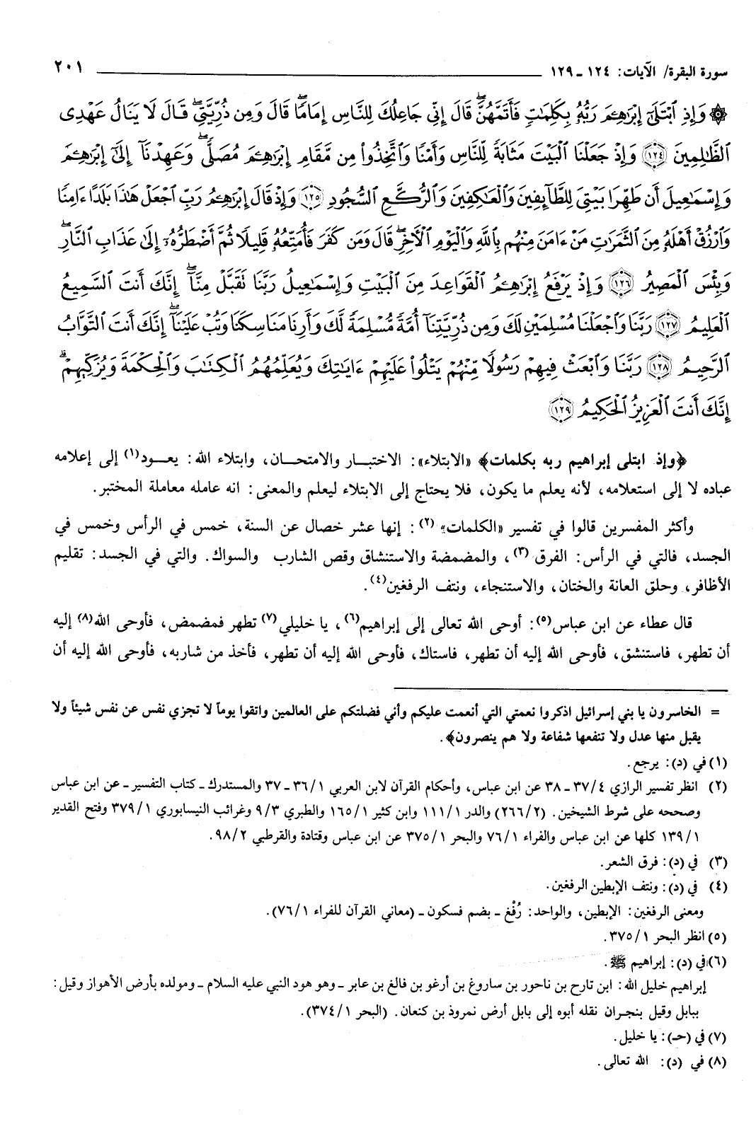 وَإِذِ ابْتَلَى إِبْرَاهِيمَ رَبُّهُ بِكَلِمَاتٍ فَأَتَمَّهُنَّ قَالَ إِنِّي جَاعِلُكَ لِلنَّاسِ إِمَامًا قَالَ وَمِنْ ذُرِّيَّتِي قَالَ لا يَنَالُ عَهْدِي الظَّالِمِينَ {124} وَإِذْ جَعَلْنَا الْبَيْتَ مَثَابَةً لِلنَّاسِ وَأَمْنًا وَاتَّخِذُوا مِنْ مَقَامِ إِبْرَاهِيمَ مُصَلًّى وَعَهِدْنَا إِلَى إِبْرَاهِيمَ وَإِسْمَاعِيلَ أَنْ طَهِّرَا بَيْتِيَ لِلطَّائِفِينَ وَالْعَاكِفِينَ وَالرُّكَّعِ السُّجُودِ {125} وَإِذْ قَالَ إِبْرَاهِيمُ رَبِّ اجْعَلْ هَذَا بَلَدًا آمِنًا وَارْزُقْ أَهْلَهُ مِنَ الثَّمَرَاتِ مَنْ آمَنَ مِنْهُمْ بِاللَّهِ وَالْيَوْمِ الآخِرِ قَالَ وَمَنْ كَفَرَ فَأُمَتِّعُهُ قَلِيلا ثُمَّ أَضْطَرُّهُ إِلَى عَذَابِ النَّارِ وَبِئْسَ الْمَصِيرُ {126} وَإِذْ يَرْفَعُ إِبْرَاهِيمُ الْقَوَاعِدَ مِنَ الْبَيْتِ وَإِسْمَاعِيلُ رَبَّنَا تَقَبَّلْ مِنَّا إِنَّكَ أَنْتَ السَّمِيعُ الْعَلِيمُ {127} رَبَّنَا وَاجْعَلْنَا مُسْلِمَيْنِ لَكَ وَمِنْ ذُرِّيَّتِنَا أُمَّةً مُسْلِمَةً لَكَ وَأَرِنَا مَنَاسِكَنَا وَتُبْ عَلَيْنَا إِنَّكَ أَنْتَ التَّوَّابُ الرَّحِيمُ {128} رَبَّنَا وَابْعَثْ فِيهِمْ رَسُولا مِنْهُمْ يَتْلُو عَلَيْهِمْ آيَاتِكَ وَيُعَلِّمُهُمُ الْكِتَابَ وَالْحِكْمَةَ وَيُزَكِّيهِمْ إِنَّكَ أَنْتَ الْعَزِيزُ الْحَكِيمُ {129} } [البقرة: 124-129] {وَإِذِ ابْتَلَى إِبْرَاهِيمَ رَبُّهُ بِكَلِمَاتٍ} [البقرة: 124] الابتلاء: الاختبار والامتحان، وابتلاء الله يعود إلى إعلامه عباده لا إلى استعلامه، لأنه يعلم ما يكون، فلا يحتاج إلى الابتلاء ليعلم، والمعنى: أنه عامله معاملة المختبر.