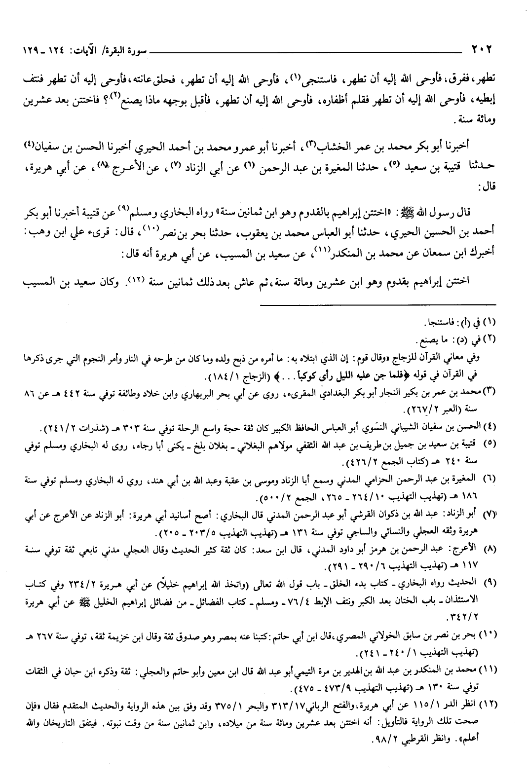 40 - أَخْبَرَنَا أَبُو بَكْرٍ مُحَمَّدُ بْنُ عُمَرَ الْخَشَّابُ، أَخْبَرَنَا أَبُو عَمْرٍو مُحَمَّدُ بْنُ أَحْمَدَ الْحِيرِيُّ، أَخْبَرَنَا الْحَسَنُ بْنُ سُفْيَانَ، حَدَّثَنَا قُتَيْبَةُ بْنُ سَعِيدٍ، حَدَّثَنَا الْمُغِيرَةُ بْنُ عَبْدِ الرَّحْمَنِ، عَنْ أَبِي الزِّنَادِ، عَنِ الأَعْرَجِ، عَنْ أَبِي هُرَيْرَةَ، قَالَ: قَالَ رَسُولُ اللَّهِ صَلَّى اللهُ عَلَيْهِ وَسَلَّمَ: «اخْتَتَنَ إِبْرَاهِيمُ بِالْقَدُومِ، وَهُوَ ابْنُ ثَمَانِينَ سَنَةً» رَوَاهُ الْبُخَارِيُّ وَمُسْلِمٌ، عَنْ قُتَيْبَةَ