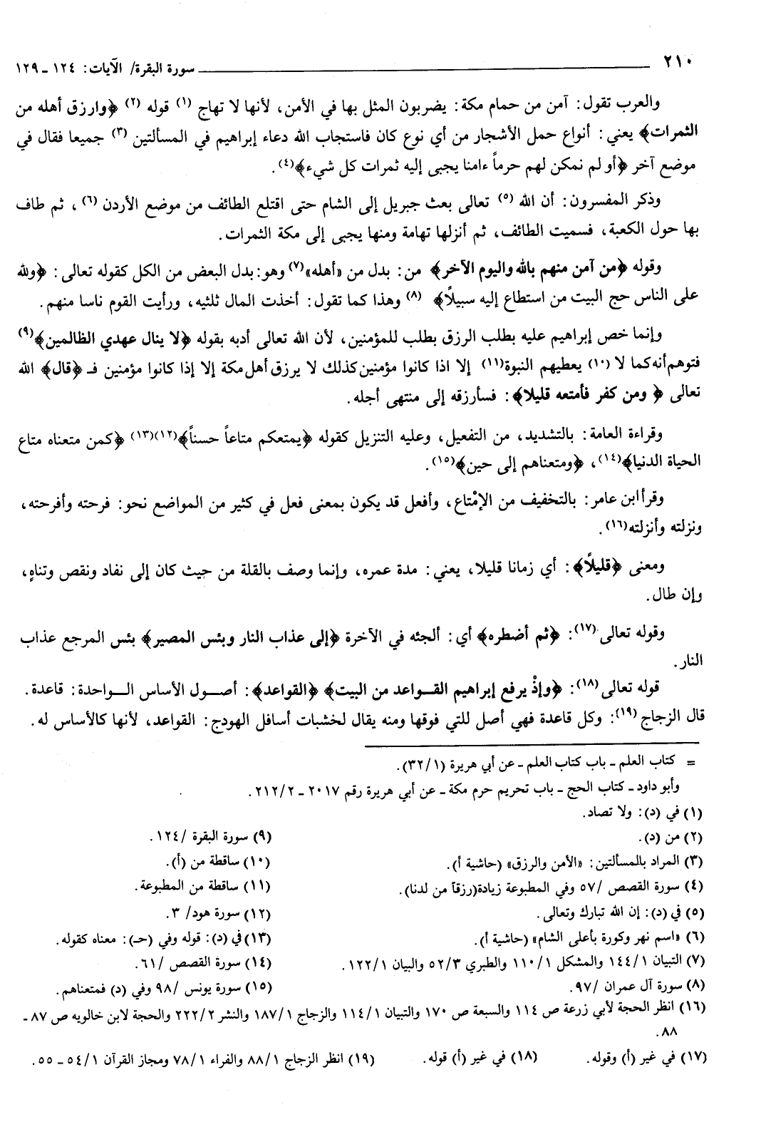 يضرب المثل بها فِي الأمن لأنها لا تهاج، قوله: {وَارْزُقْ أَهْلَهُ مِنَ الثَّمَرَاتِ} [البقرة: 126] يعني أنواع حمل الأشجار من أي نوع كان، فاستجاب الله دعاء إبراهيم فِي المسألتين جميعا، فقال فِي موضع آخر: {أَوَلَمْ نُمَكِّنْ لَهُمْ حَرَمًا آمِنًا يُجْبَى إِلَيْهِ ثَمَرَاتُ كُلِّ شَيْءٍ} [القصص: 57] ، وذكر المفسرون أن الله تعالى بعث جبريل إلى الشام حتى اقتلع الطائف من موضع الأردن، ثم طاف بها حول الكعبة، فسميت الطائف، ثم أنزلها تهامة، ومنها يجبى إلى مكة الثمرات.