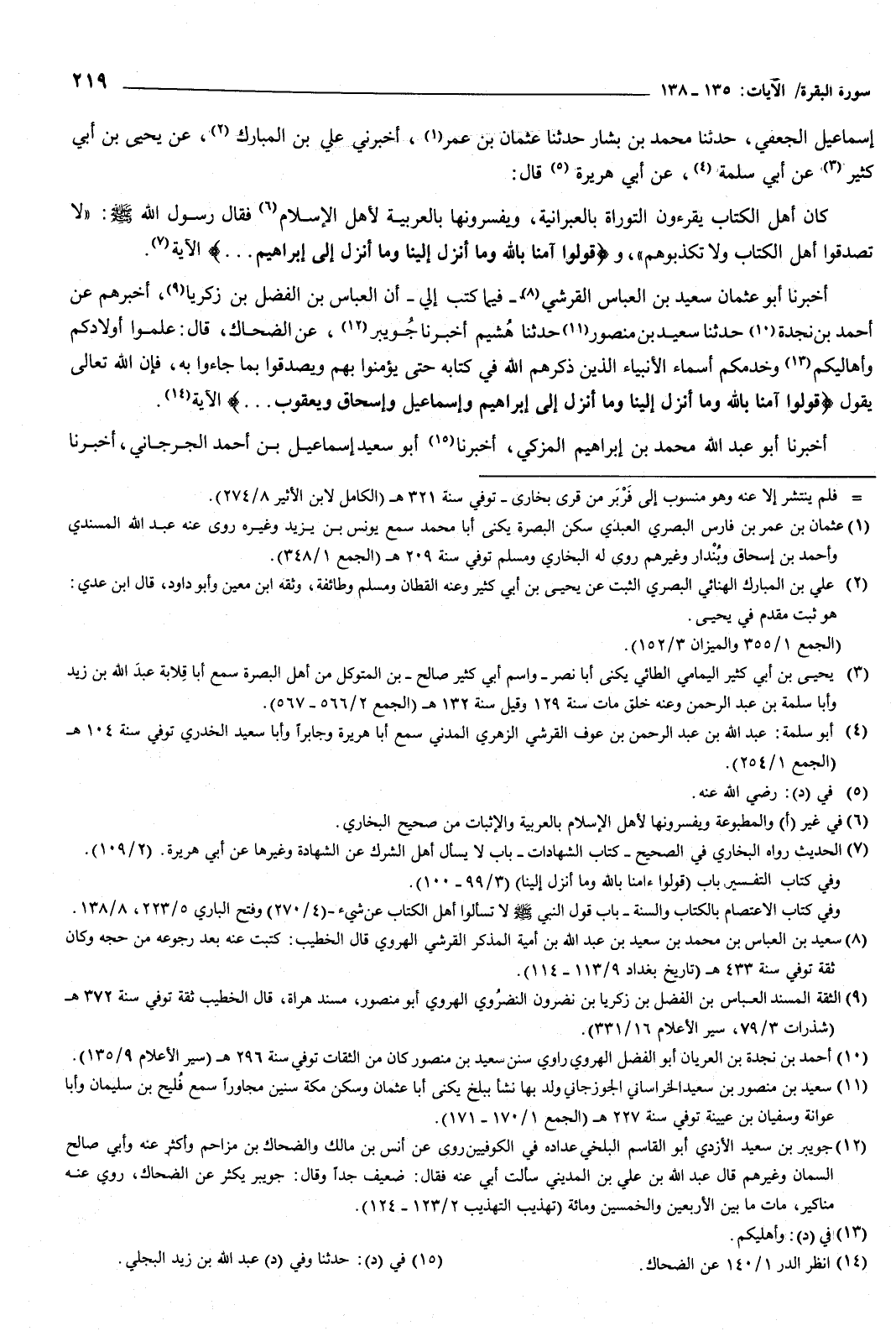 إِسْمَاعِيلَ الْجُعْفِيُّ، حَدَّثَنَا مُحَمَّدُ بْنُ بَشَّارٍ، حَدَّثَنَا عُثْمَانُ بْنُ عُمَرَ، أَخْبَرَنِي عَلِيُّ بْنُ الْمُبَارَكِ، عَنْ يَحْيَى بْنِ أَبِي كَثِيرٍ، عَنْ أَبِي سَلَمَةَ، عَنْ أَبِي هُرَيْرَةَ قَالَ: كَانَ أَهْلُ الْكِتَابِ يَقْرَءُونَ التَّوْرَاةَ بِالْعَبْرَانِيَّةِ، وَيُفَسِّرُونَهَا بِالْعَرَبِيَّةِ لأَهْلِ الإِسْلامِ، فَقَالَ رَسُولُ اللَّهِ صَلَّى اللهُ عَلَيْهِ وَسَلَّمَ: «لا تُصَدِّقُوا أَهْلَ الْكِتَابِ وَلا تُكَذِّبُوهُمْ» ، وَ {قُولُوا آمَنَّا بِاللَّهِ وَمَا أُنْزِلَ إِلَيْنَا وَمَا أُنْزِلَ إِلَى إِبْرَاهِيمَ} [البقرة: 136] الآيَةَ