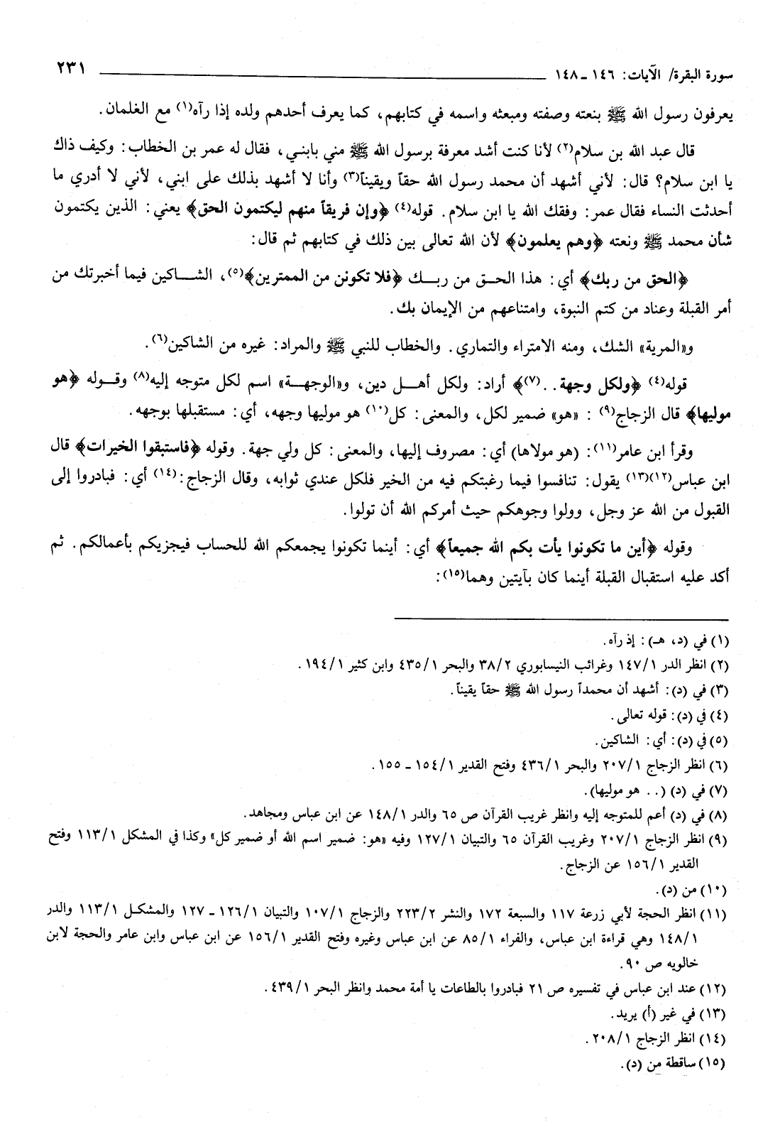 ثم قال: {الْحَقُّ مِنْ رَبِّكَ} [البقرة: 147] أي: هذا الحق من ربك، {فَلا تَكُونَنَّ مِنَ الْمُمْتَرِينَ} [البقرة: 147] الشاكين فيما أخبرتك من أمر القبلة وعناد من كتم النبوة، وامتناعهم من الإيمان بك.