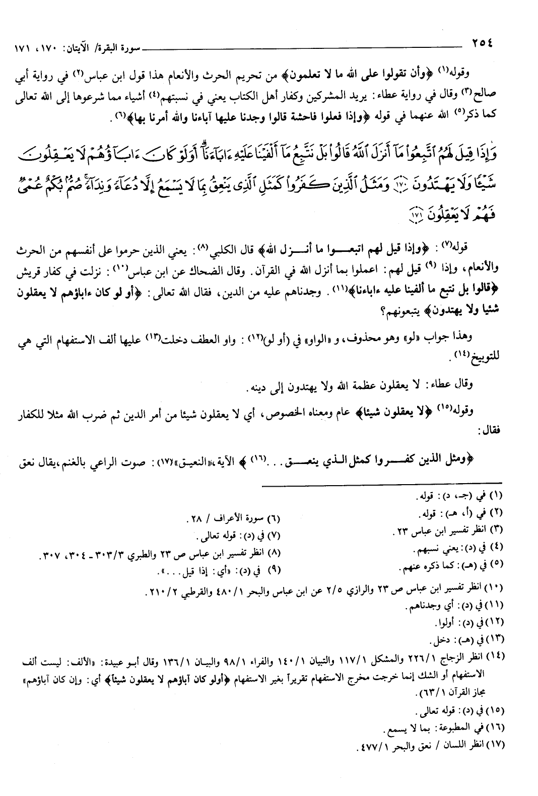 {وَإِذَا قِيلَ لَهُمُ اتَّبِعُوا مَا أَنْزَلَ اللَّهُ قَالُوا بَلْ نَتَّبِعُ مَا أَلْفَيْنَا عَلَيْهِ آبَاءَنَا أَوَلَوْ كَانَ آبَاؤُهُمْ لا يَعْقِلُونَ شَيْئًا وَلا يَهْتَدُونَ {170} وَمَثَلُ الَّذِينَ كَفَرُوا كَمَثَلِ الَّذِي يَنْعِقُ بِمَا لا يَسْمَعُ إِلا دُعَاءً وَنِدَاءً صُمٌّ بُكْمٌ عُمْيٌ فَهُمْ لا يَعْقِلُونَ {171} } [البقرة: 170-171] قوله: {وَإِذَا قِيلَ لَهُمُ اتَّبِعُوا مَا أَنْزَلَ اللَّهُ} [البقرة: 170] قال الكلبي: يعني الذين حرموا على أنفسهم من الحرث والأنعام، وإذا قيل لهم: اعملوا بما أنزل الله فِي القرآن.