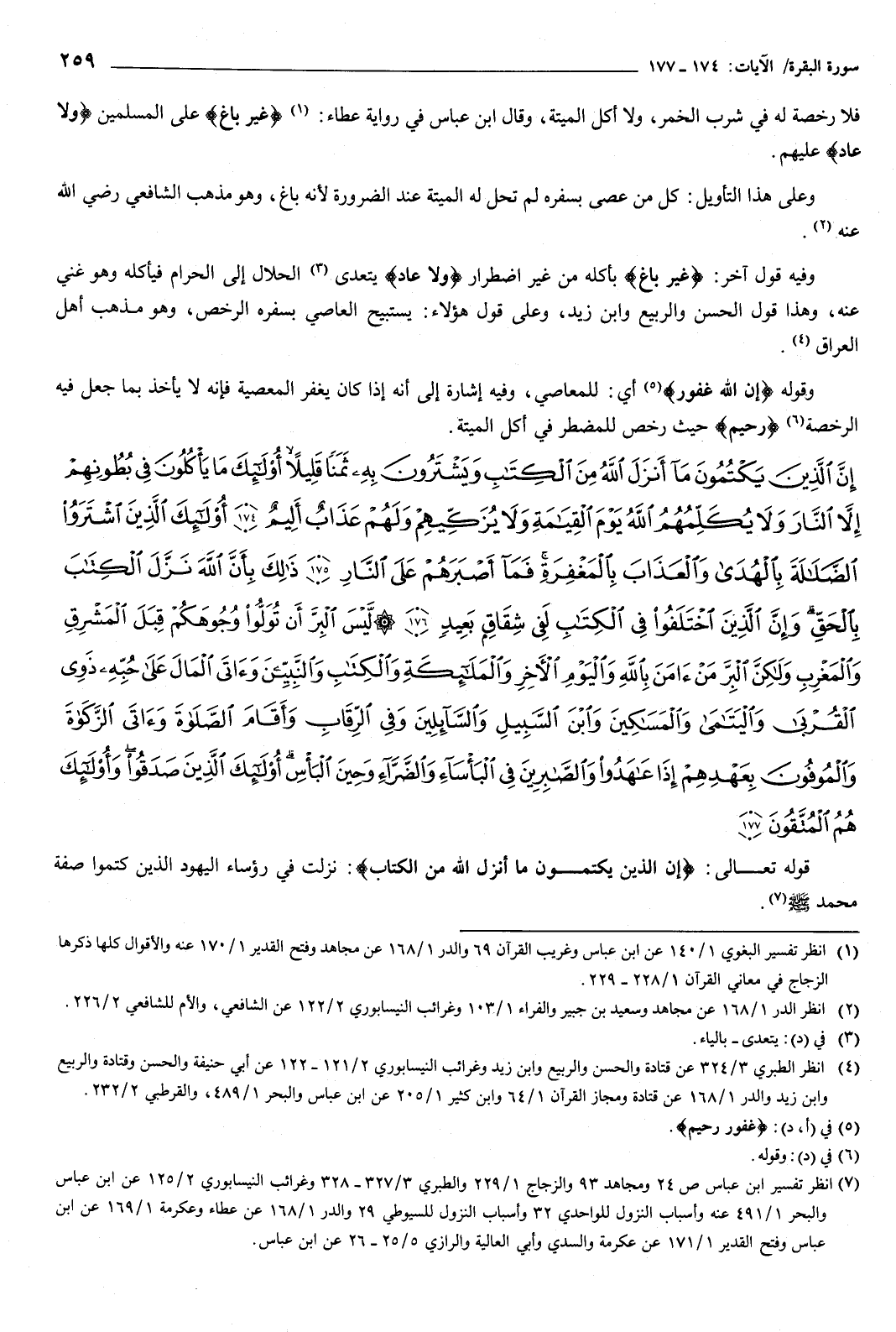 {إِنَّ الَّذِينَ يَكْتُمُونَ مَا أَنْزَلَ اللَّهُ مِنَ الْكِتَابِ وَيَشْتَرُونَ بِهِ ثَمَنًا قَلِيلا أُولَئِكَ مَا يَأْكُلُونَ فِي بُطُونِهِمْ إِلا النَّارَ وَلا يُكَلِّمُهُمُ اللَّهُ يَوْمَ الْقِيَامَةِ وَلا يُزَكِّيهِمْ وَلَهُمْ عَذَابٌ أَلِيمٌ {174} أُولَئِكَ الَّذِينَ اشْتَرَوُا الضَّلالَةَ بِالْهُدَى وَالْعَذَابَ بِالْمَغْفِرَةِ فَمَا أَصْبَرَهُمْ عَلَى النَّارِ {175} ذَلِكَ بِأَنَّ اللَّهَ نَزَّلَ الْكِتَابَ بِالْحَقِّ وَإِنَّ الَّذِينَ اخْتَلَفُوا فِي الْكِتَابِ لَفِي شِقَاقٍ بَعِيدٍ {176} لَيْسَ الْبِرَّ أَنْ تُوَلُّوا وُجُوهَكُمْ قِبَلَ الْمَشْرِقِ وَالْمَغْرِبِ وَلَكِنَّ الْبِرَّ مَنْ آمَنَ بِاللَّهِ وَالْيَوْمِ الآخِرِ وَالْمَلائِكَةِ وَالْكِتَابِ وَالنَّبِيِّينَ وَآتَى الْمَالَ عَلَى حُبِّهِ ذَوِي الْقُرْبَى وَالْيَتَامَى وَالْمَسَاكِينَ وَابْنَ السَّبِيلِ وَالسَّائِلِينَ وَفِي الرِّقَابِ وَأَقَامَ الصَّلاةَ وَآتَى الزَّكَاةَ وَالْمُوفُونَ بِعَهْدِهِمْ إِذَا عَاهَدُوا وَالصَّابِرِينَ فِي الْبَأْسَاءِ وَالضَّرَّاءِ وَحِينَ الْبَأْسِ أُولَئِكَ الَّذِينَ صَدَقُوا وَأُولَئِكَ هُمُ الْمُتَّقُونَ {177} } [البقرة: 174-177] قوله تعالى: {إِنَّ الَّذِينَ يَكْتُمُونَ مَا أَنْزَلَ اللَّهُ مِنَ الْكِتَابِ} [البقرة: 174] نزلت فِي رؤساء اليهود الذين كتموا صفة محمد صَلَّى اللهُ عَلَيْهِ وَسَلَّمَ.