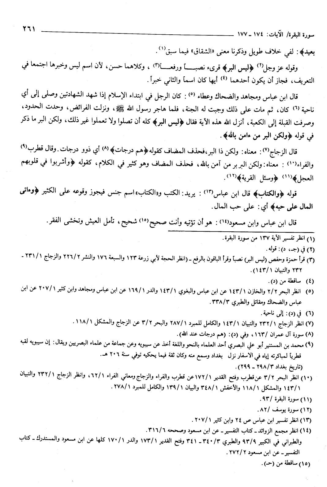 وقال قطرب، والفراء: معناه: ولكن البر بر من آمن بالله، فحذف المضاف وهو كثير فِي الكلام، كقوله: {وَأُشْرِبُوا فِي قُلُوبِهِمُ الْعِجْلَ} [البقرة: 93] ، {وَاسْأَلِ الْقَرْيَةَ} [يوسف: 82] .