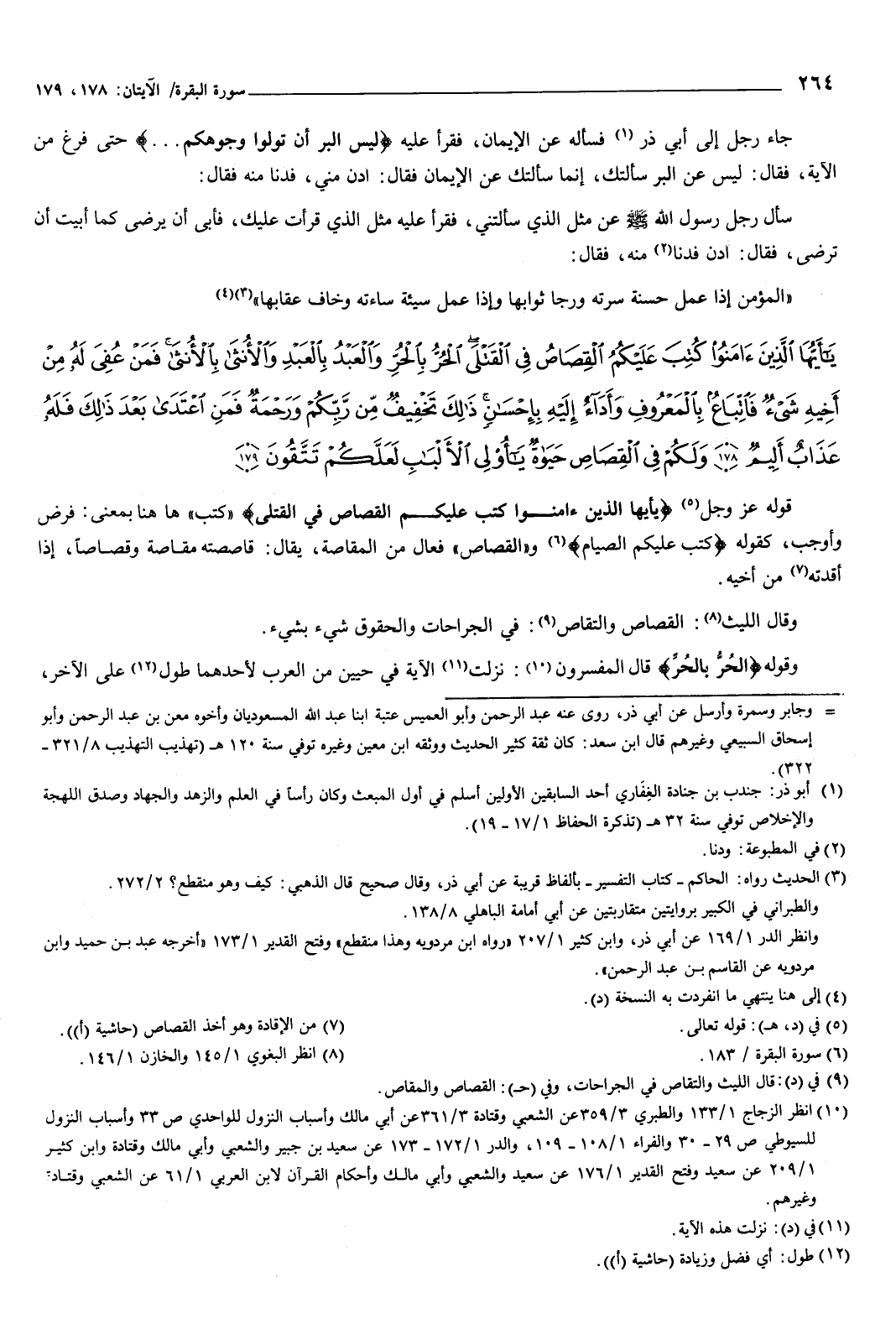 {يَأَيُّهَا الَّذِينَ آمَنُوا كُتِبَ عَلَيْكُمُ الْقِصَاصُ فِي الْقَتْلَى الْحُرُّ بِالْحُرِّ وَالْعَبْدُ بِالْعَبْدِ وَالأُنْثَى بِالأُنْثَى فَمَنْ عُفِيَ لَهُ مِنْ أَخِيهِ شَيْءٌ فَاتِّبَاعٌ بِالْمَعْرُوفِ وَأَدَاءٌ إِلَيْهِ بِإِحْسَانٍ ذَلِكَ تَخْفِيفٌ مِنْ رَبِّكُمْ وَرَحْمَةٌ فَمَنِ اعْتَدَى بَعْدَ ذَلِكَ فَلَهُ عَذَابٌ أَلِيمٌ {178} وَلَكُمْ فِي الْقِصَاصِ حَيَاةٌ يَا أُولِي الأَلْبَابِ لَعَلَّكُمْ تَتَّقُونَ {179} } [البقرة: 178-179] قوله عز وجل: {يَأَيُّهَا الَّذِينَ آمَنُوا كُتِبَ عَلَيْكُمُ الْقِصَاصُ فِي الْقَتْلَى} [البقرة: 178] : كتب ههنا بمعنى: فرض وأوجب، كقوله: {كُتِبَ عَلَيْكُمُ الصِّيَامُ} [البقرة: 183] والقصاص فعال من المقاصة، يقال: قاصصته مقاصة وقصاصا، إذا أقدته من أخيه.