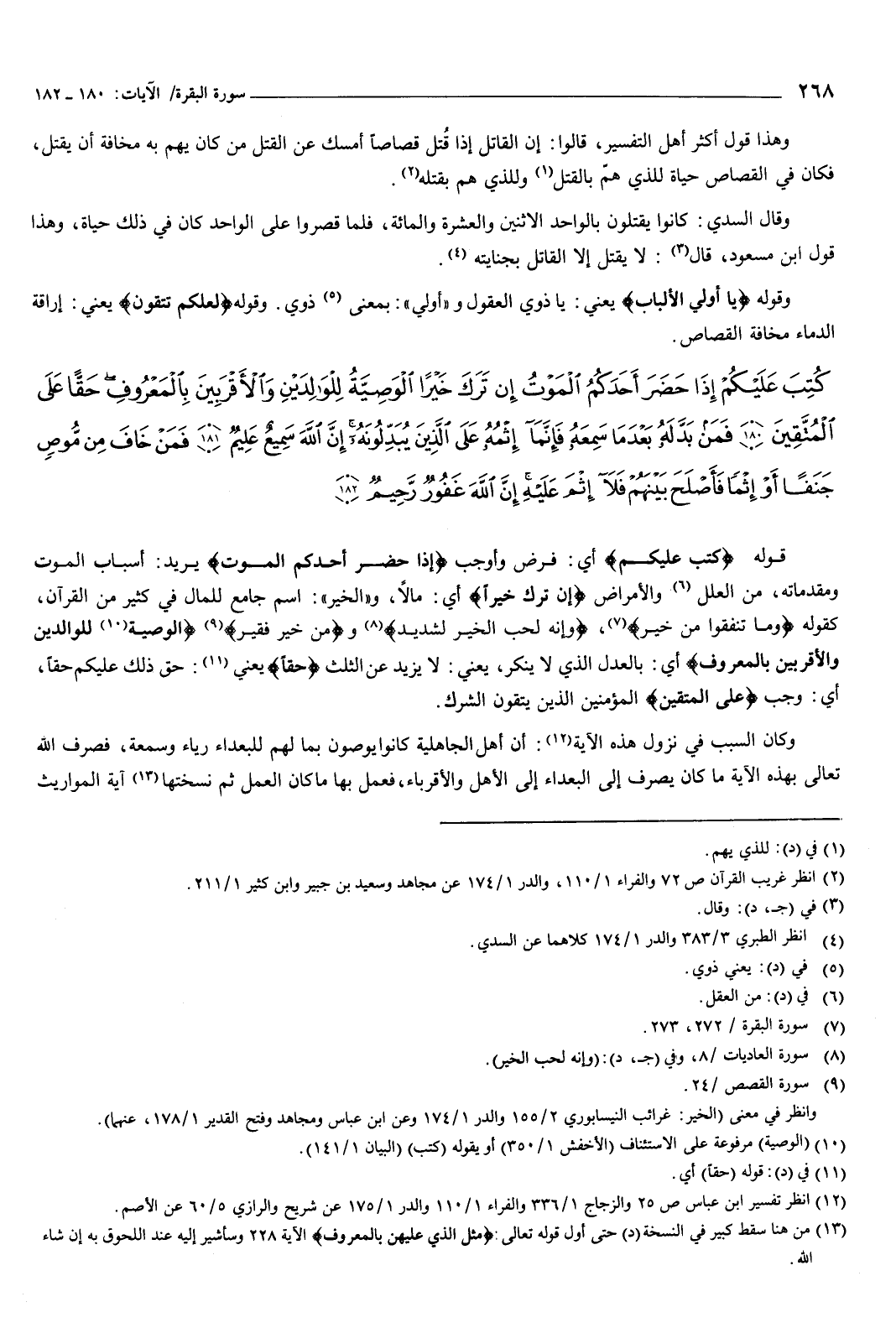 {كُتِبَ عَلَيْكُمْ إِذَا حَضَرَ أَحَدَكُمُ الْمَوْتُ إِنْ تَرَكَ خَيْرًا الْوَصِيَّةُ لِلْوَالِدَيْنِ وَالأَقْرَبِينَ بِالْمَعْرُوفِ حَقًّا عَلَى الْمُتَّقِينَ {180} فَمَنْ بَدَّلَهُ بَعْدَ مَا سَمِعَهُ فَإِنَّمَا إِثْمُهُ عَلَى الَّذِينَ يُبَدِّلُونَهُ إِنَّ اللَّهَ سَمِيعٌ عَلِيمٌ {181} فَمَنْ خَافَ مِنْ مُوصٍ جَنَفًا أَوْ إِثْمًا فَأَصْلَحَ بَيْنَهُمْ فَلا إِثْمَ عَلَيْهِ إِنَّ اللَّهَ غَفُورٌ رَحِيمٌ {182} } [البقرة: 180-182] قوله: كتب عليكم أي: فرض وأوجب، {إِذَا حَضَرَ أَحَدَكُمُ الْمَوْتُ} [البقرة: 180] يريد: أسباب الموت ومقدماته من العلل والأمراض، {إِنْ تَرَكَ خَيْرًا} [البقرة: 180] أي: مالا، والخير: اسم جامع للمال فِي كثير من القرآن، كقوله: {وَمَا تُنْفِقُوا مِنْ خَيْرٍ} [البقرة: 272] ، {وَإِنَّهُ لِحُبِّ الْخَيْرِ لَشَدِيدٌ} [العاديات: 8] ، و {مِنْ خَيْرٍ فَقِيرٌ} [القصص: 24] ، {الْوَصِيَّةُ لِلْوَالِدَيْنِ وَالأَقْرَبِينَ بِالْمَعْرُوفِ} [البقرة: 180] أي: بالعدل الذي لا ينكر، يعني: لا يزيد عن الثلث، حقا يعني: حق ذلك عليكم حقا، أي: وجب، على المتقين المؤمنين الذين يتقون الشرك.