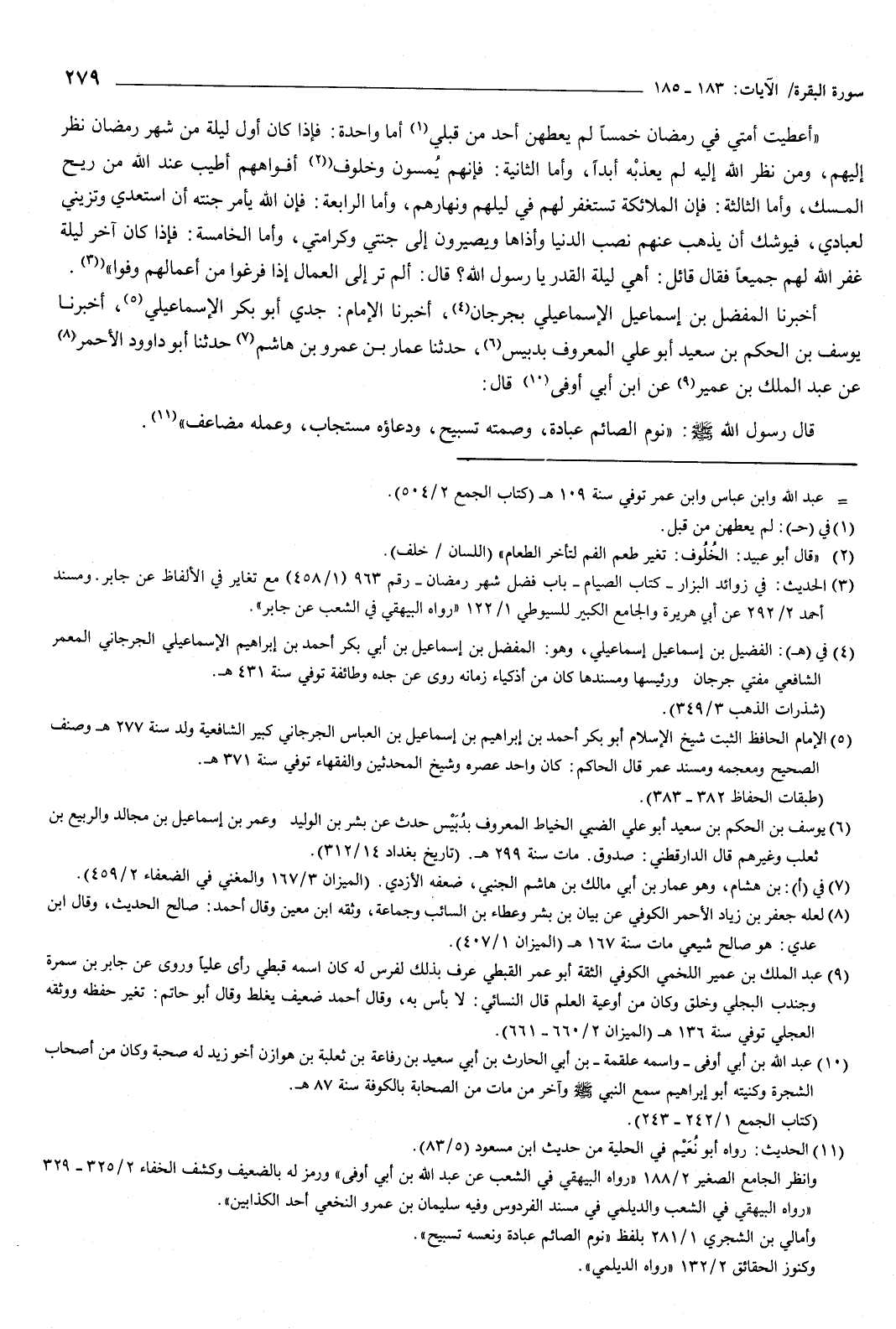 81 - أَخْبَرَنَا الْمُفَضَّلُ بْنُ إِسْمَاعِيلَ الإِسْمَاعِيلِيُّ بِجُرْجَانَ، أَخْبَرَنَا الإِمَامُ: جَدِّي أَبُو بَكْرٍ الإِسْمَاعِيلِيُّ، أَخْبَرَنَا يُوسُف بْنُ الْحَكَمِ بْنِ سَعِيدٍ أَبُو عَلِيٍّ الْمَعْرُوفُ بِدُبَيْسٍ، حَدَّثَنَا عَمَّارُ بْنُ عَمْرِو بْنِ هَاشِمٍ، حَدَّثَنَا أَبُو دَاوُدَ الأَحْمَرُ، عَنْ عَبْدِ الْمَلِكِ بْنِ عُمَيْرٍ، عَنِ ابْنِ أَبِي أَوْفَى قَالَ: قَالَ رَسُولُ اللَّهِ صَلَّى اللهُ عَلَيْهِ وَسَلَّمَ: «نَوْمُ الصَّائِمِ عِبَادَةٌ، وَصَمْتُهُ تَسْبِيحٌ، وَدُعَاؤُهُ مُسْتَجَابٌ، وَعَمَلُهُ مُضَاعَفٌ»