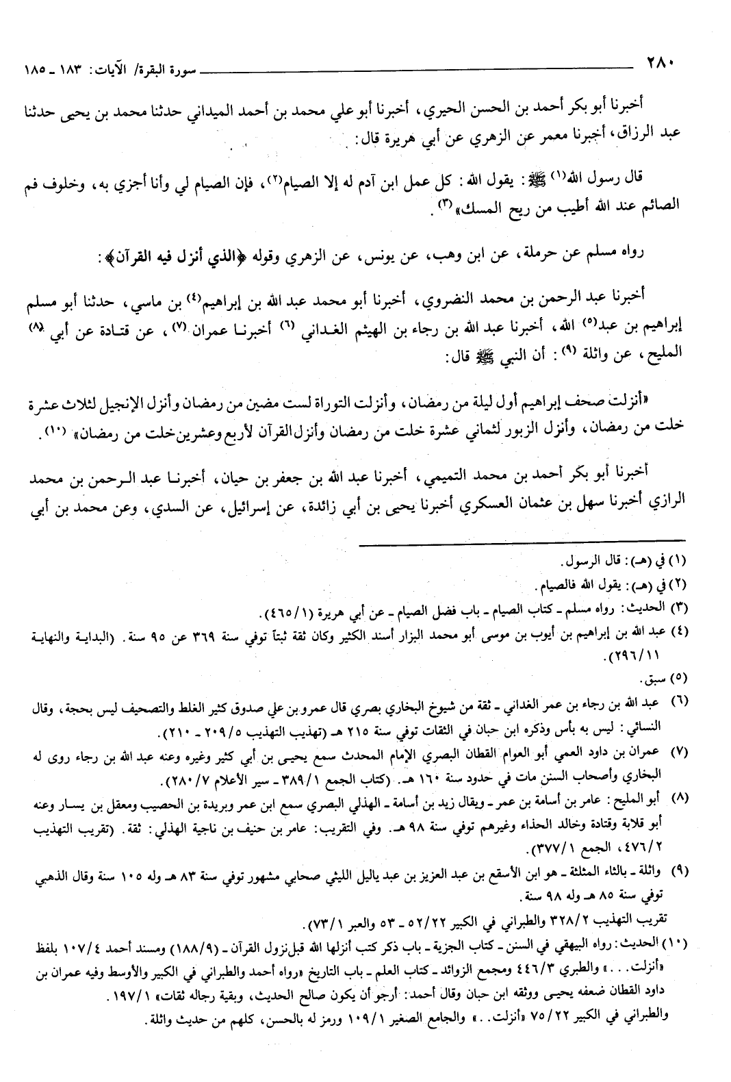 83 - أَخْبَرَنَا عَبْدُ الرَّحْمَنِ بْنُ مُحَمَّدٍ النَّضْرُوِيُّ، أَخْبَرَنَا أَبُو مُحَمَّدٍ عَبْدُ اللَّهِ بْنُ إِبْرَاهِيمَ بْنِ مَاسِيٍّ، حَدَّثَنَا أَبُو مُسْلِمٍ إِبْرَاهِيمُ بْنُ عَبْدِ اللَّهِ، أَخْبَرَنَا عَبْدُ اللَّهِ بْنُ رَجَاءِ بْنِ الْهَيْثَمِ الْغُدَانِيُّ، أَخْبَرَنَا عِمْرَانُ، عَنْ قَتَادَةَ، عَنْ أَبِي الْمَلِيحِ، عَنْ وَاثِلَةَ: أَنَّ النَّبِيَّ صَلَّى اللهُ عَلَيْهِ وَسَلَّمَ قَالَ: «أُنْزِلَتْ صُحُفُ إِبْرَاهِيمَ أَوَّلَ لَيْلَةٍ مِنْ رَمَضَانَ، وَأُنْزِلَتِ التَّوْرَاةُ لِسِتٍّ مَضَيْنَ مِنْ رَمَضَانَ، وَأُنْزِلَ الإِنْجِيلُ لِثَلاثَ عَشْرَةَ خَلَتْ مِنْ رَمَضَانَ، وَأُنْزِلَ الزَّبُورُ لِثَمَانِي عَشْرَةَ خَلَتْ مِنْ رَمَضَانَ، وَأُنْزِلَ الْقُرْآنُ لأَرْبَعٍ وَعِشْرِينَ خَلَتْ مِنْ رَمَضَانَ»