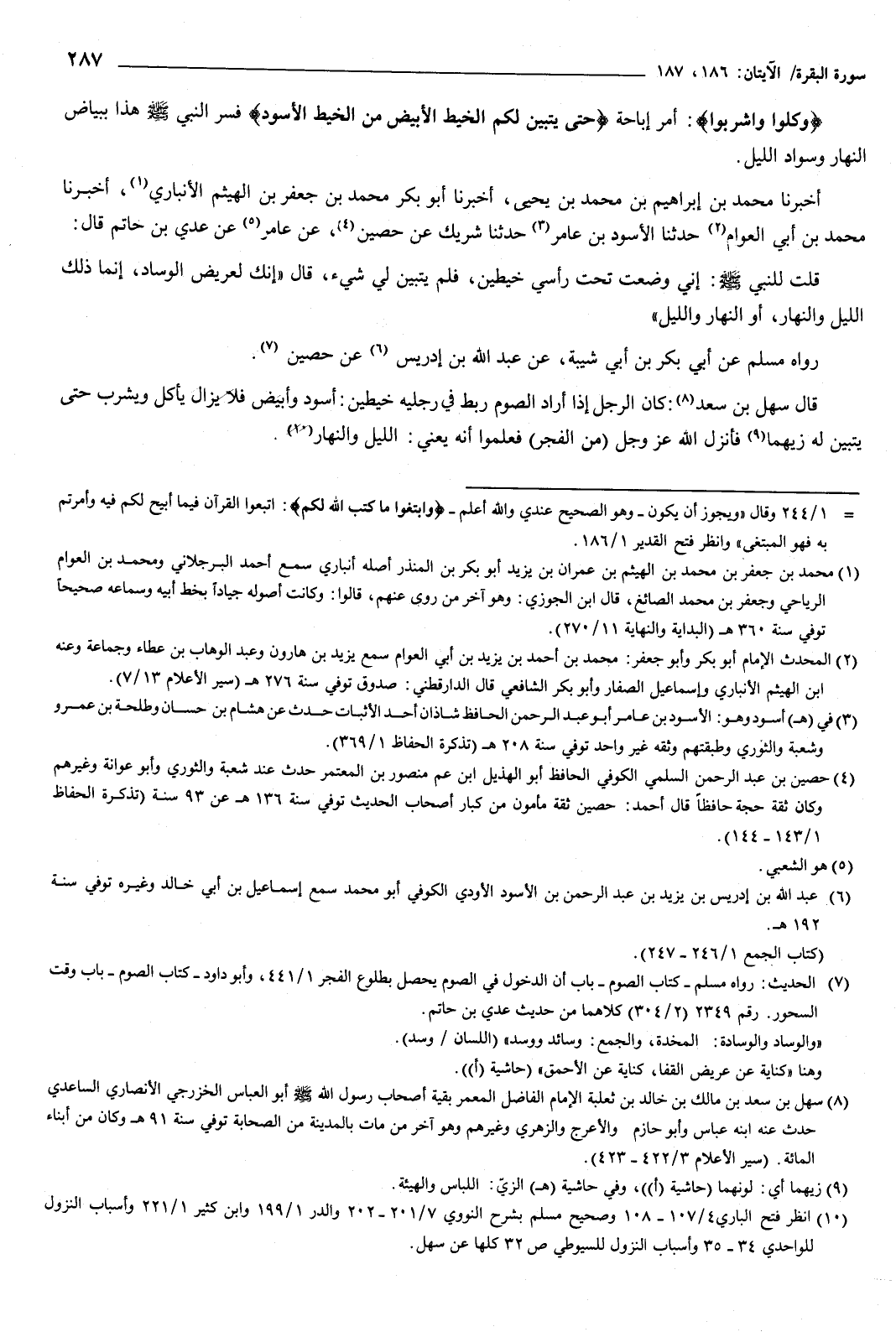 قال سهل بن سعد: كان الرجل إذا أراد الصوم ربط فِي رجليه خيطين: أسود وأبيض، فلا يزال يأكل ويشرب حتى يتبين له زيهما، فأنزل الله عز وجل: من الفجر فعلموا أنه يعني: الليل والنهار.