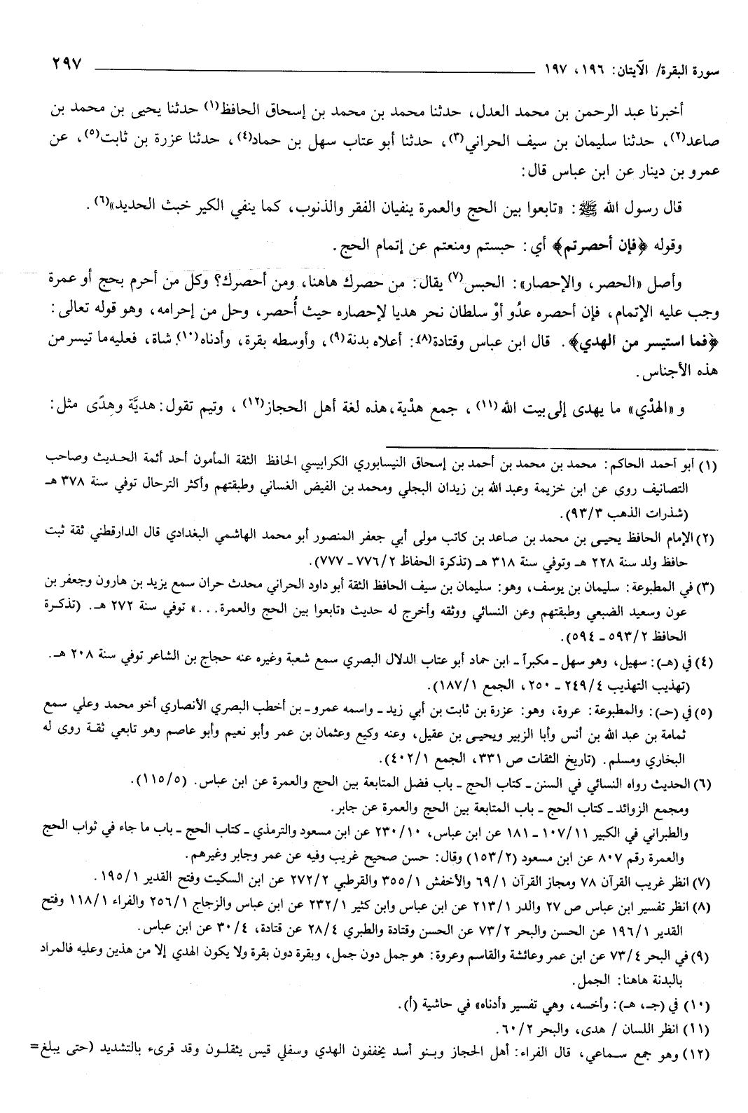 وأصل الحصر والإحصار: الحبس، يقال: من حصرك ههنا، ومن أحصرك؟ وكل من أحرم بحج أو عمرة وجب عليه الإتمام، فإن أحصره عدو أو سلطان نحر هديا لإحصاره حيث أحصر، وحل من إحرامه، وهو قوله تعالى: {فَمَا اسْتَيْسَرَ مِنَ الْهَدْيِ} [البقرة: 196] ، قال ابن عباس، وقتادة: أعلاه بدنة، وأوسطه بقرة، وأدناه شاة، فعليه ما تيسر من هذه الأجناس.