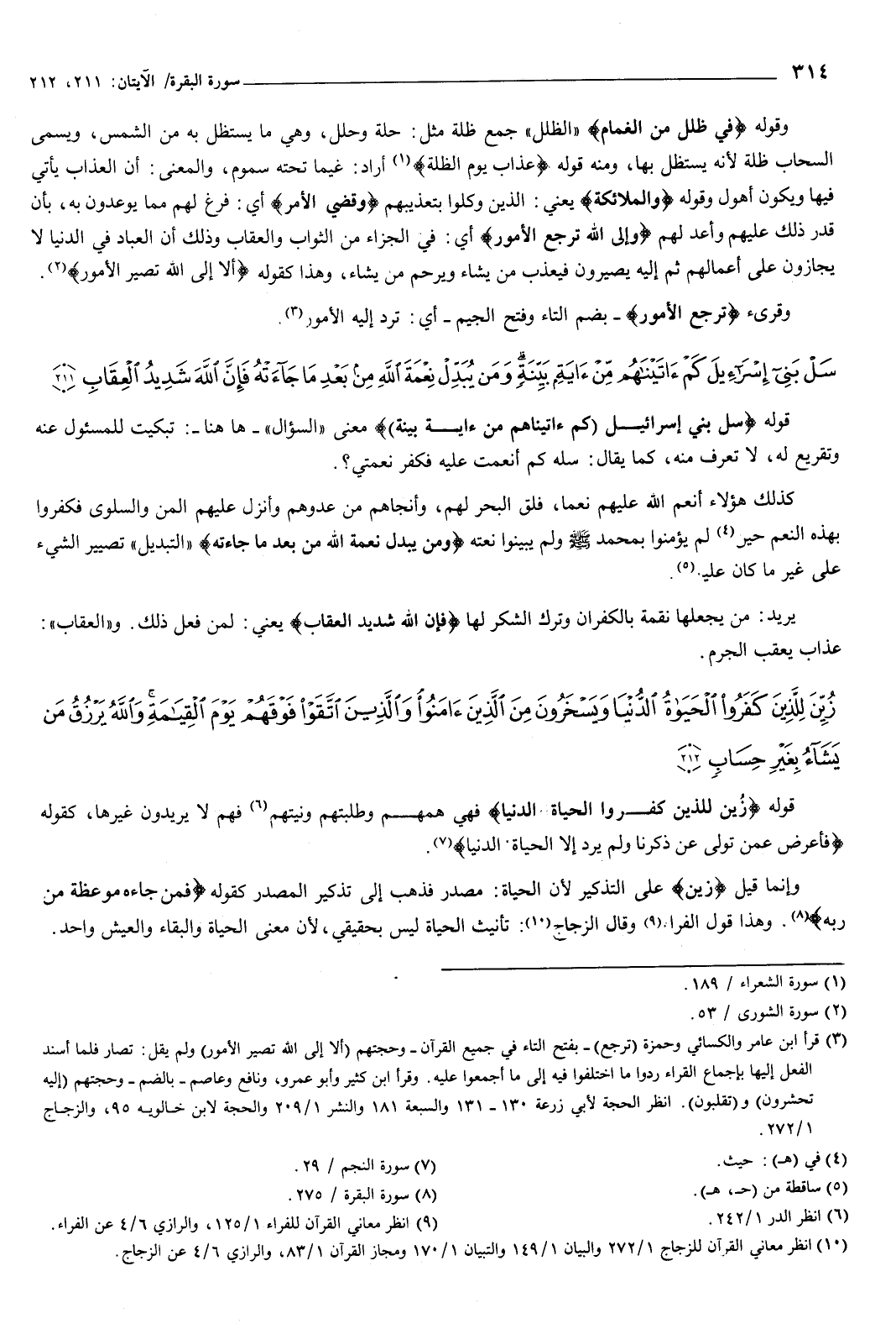 {سَلْ بَنِي إِسْرَائِيلَ كَمْ آتَيْنَاهُمْ مِنْ آيَةٍ بَيِّنَةٍ وَمَنْ يُبَدِّلْ نِعْمَةَ اللَّهِ مِنْ بَعْدِ مَا جَاءَتْهُ فَإِنَّ اللَّهَ شَدِيدُ الْعِقَابِ} [البقرة: 211] قوله: {سَلْ بَنِي إِسْرَائِيلَ كَمْ آتَيْنَاهُمْ مِنْ آيَةٍ بَيِّنَةٍ} [البقرة: 211] معنى السؤال ههنا: تبكيت للمسئول عنه وتقريع له، لا تعرف منه، كما يقال: سله كم أنعمت عليه فكفر نعمتي؟ كذلك هؤلاء، أنعم الله عليهم نعما، فلق البحر لهم، وأنجاهم من عدوهم، وأنزل عليهم المن والسلوى فكفروا بهذه النعم حين لم يؤمنوا بمحمد صَلَّى اللهُ عَلَيْهِ وَسَلَّمَ ولم يبينوا نعته، {وَمَنْ يُبَدِّلْ نِعْمَةَ اللَّهِ مِنْ بَعْدِ مَا جَاءَتْهُ} [البقرة: 211] التبديل: تصيير الشيء على غير ما كان عليه، يريد: من يجعلها نقمة بالكفران وترك الشكر لها، {فَإِنَّ اللَّهَ شَدِيدُ الْعِقَابِ} [البقرة: 211] يعني: لمن فعل ذلك، والعقاب: عذاب يعقب الجرم.