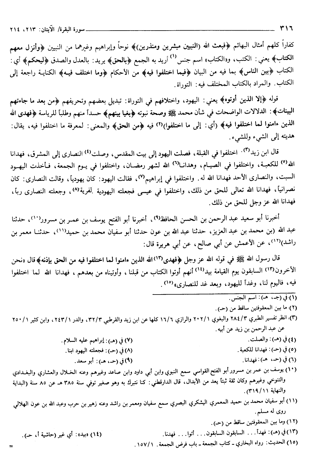 قوله: {إِلا الَّذِينَ أُوتُوهُ} [البقرة: 213] يعني: اليهود، واختلافهم في التوراة: تبديل بعضهم وتحريفهم، {مِنْ بَعْدِ مَا جَاءَتْهُمُ الْبَيِّنَاتُ} [البقرة: 213] الدلالات الواضحات في شأن محمد صَلَّى اللهُ عَلَيْهِ وَسَلَّمَ وصحة نبوته، بغيا بينهم حسدا منهم وطلبا للرياسة، {فَهَدَى اللَّهُ الَّذِينَ آمَنُوا لِمَا اخْتَلَفُوا فِيهِ} [البقرة: 213] أي: إلى ما اختلفوا فيه، من الحق والمعنى: لمعرفة ما اختلفوا فيه، يقال: هديته إلى الشيء، وللشيء.
