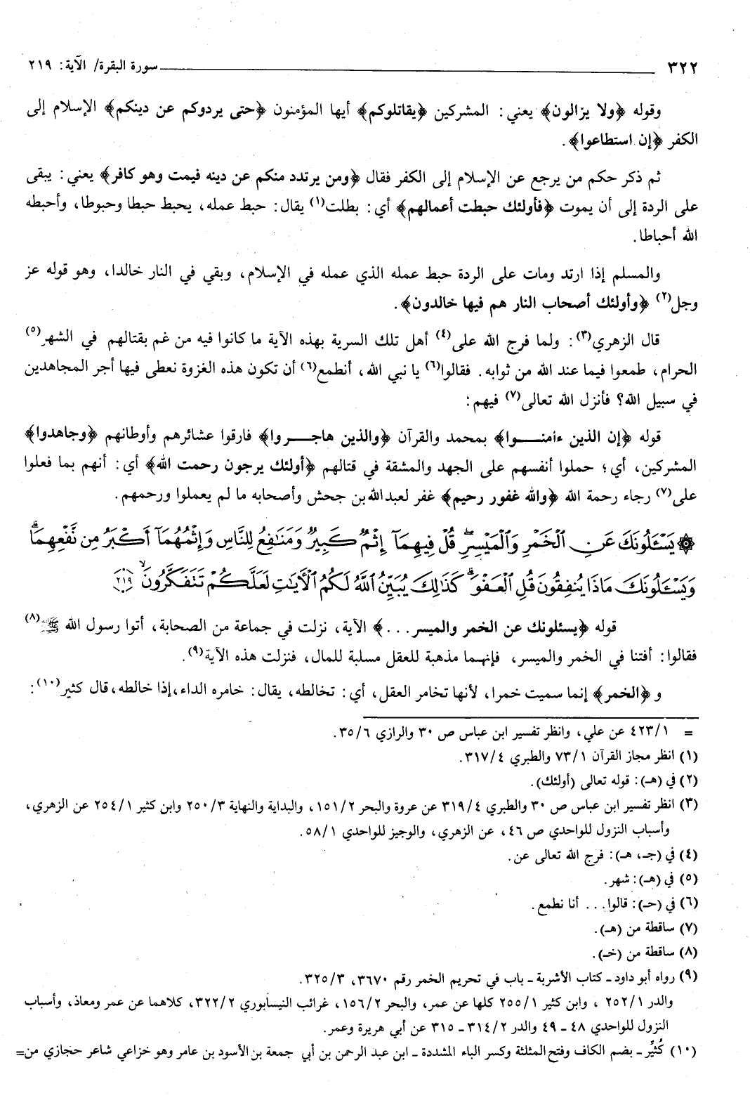 {يَسْأَلُونَكَ عَنِ الْخَمْرِ وَالْمَيْسِرِ قُلْ فِيهِمَا إِثْمٌ كَبِيرٌ وَمَنَافِعُ لِلنَّاسِ وَإِثْمُهُمَا أَكْبَرُ مِنْ نَفْعِهِمَا وَيَسْأَلُونَكَ مَاذَا يُنْفِقُونَ قُلِ الْعَفْوَ كَذَلِكَ يُبَيِّنُ اللَّهُ لَكُمُ الآيَاتِ لَعَلَّكُمْ تَتَفَكَّرُونَ} [البقرة: 219] قوله: {يَسْأَلُونَكَ عَنِ الْخَمْرِ وَالْمَيْسِرِ} [البقرة: 219] الآية، نزلت في جماعة من الصحابة، أتوا رسول الله صَلَّى اللهُ عَلَيْهِ وَسَلَّمَ فقالوا: أفتنا في الخمر والميسر، فإنهما مذهبة للعقل مسلبة للمال.