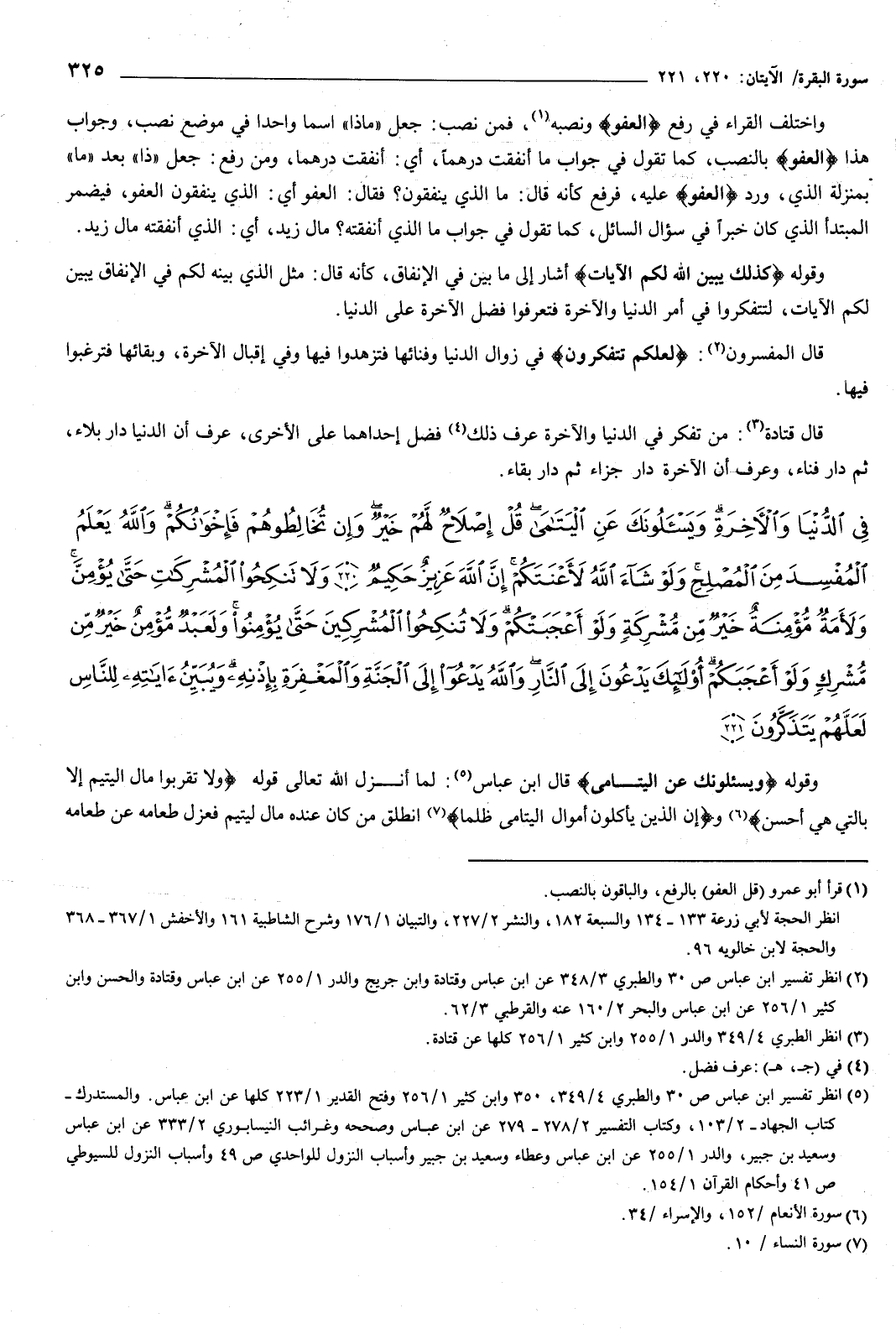 {فِي الدُّنْيَا وَالآخِرَةِ وَيَسْأَلُونَكَ عَنِ الْيَتَامَى قُلْ إِصْلاحٌ لَهُمْ خَيْرٌ وَإِنْ تُخَالِطُوهُمْ فَإِخْوَانُكُمْ وَاللَّهُ يَعْلَمُ الْمُفْسِدَ مِنَ الْمُصْلِحِ وَلَوْ شَاءَ اللَّهُ لأَعْنَتَكُمْ إِنَّ اللَّهَ عَزِيزٌ حَكِيمٌ {220} وَلا تَنْكِحُوا الْمُشْرِكَاتِ حَتَّى يُؤْمِنَّ وَلأَمَةٌ مُؤْمِنَةٌ خَيْرٌ مِنْ مُشْرِكَةٍ وَلَوْ أَعْجَبَتْكُمْ وَلا تُنْكِحُوا الْمُشْرِكِينَ حَتَّى يُؤْمِنُوا وَلَعَبْدٌ مُؤْمِنٌ خَيْرٌ مِنْ مُشْرِكٍ وَلَوْ أَعْجَبَكُمْ أُولَئِكَ يَدْعُونَ إِلَى النَّارِ وَاللَّهُ يَدْعُوَ إِلَى الْجَنَّةِ وَالْمَغْفِرَةِ بِإِذْنِهِ وَيُبَيِّنُ آيَاتِهِ لِلنَّاسِ لَعَلَّهُمْ يَتَذَكَّرُونَ {221} } [البقرة: 220-221] وقوله: {وَيَسْأَلُونَكَ عَنِ الْيَتَامَى} [البقرة: 220] قال ابن عباس: لما أنزل الله تعالى قوله: {وَلا تَقْرَبُوا مَالَ الْيَتِيمِ إِلا بِالَّتِي هِيَ أَحْسَنُ} [الأنعام: 152] ، و {إِنَّ الَّذِينَ يَأْكُلُونَ أَمْوَالَ الْيَتَامَى ظُلْمًا} [النساء: 10] انطلق من كان عنده مال ليتيم فعزل طعامه عن طعامه،